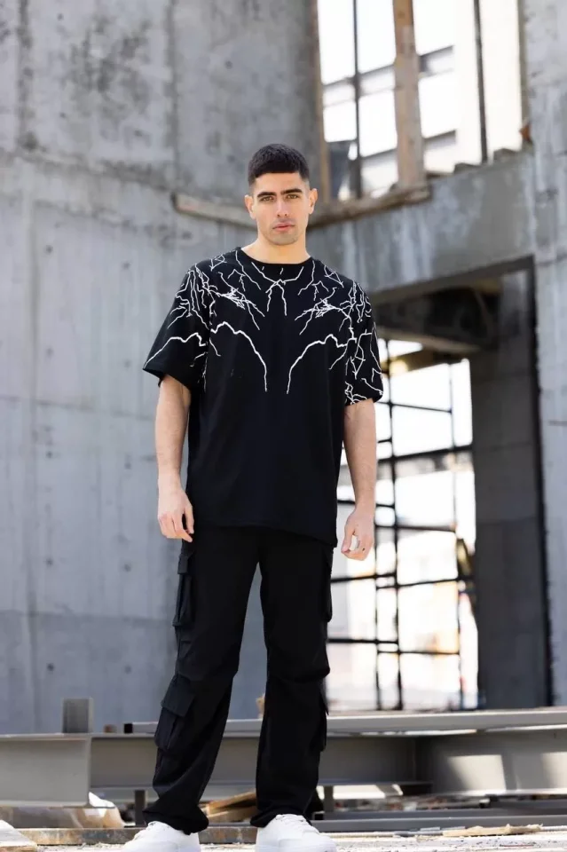 Unisex Bisiklet Yaka Baskılı Oversize T-Shirt – Siyah