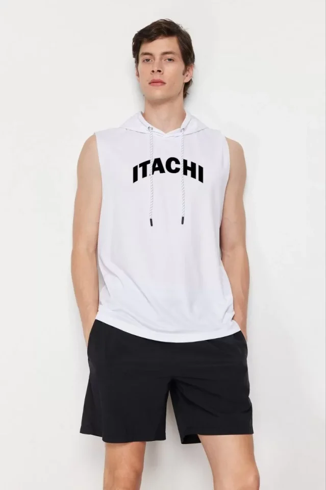 Unisex Kapşonlu Kolsuz Baskılı Oversize T-shirt – Beyaz