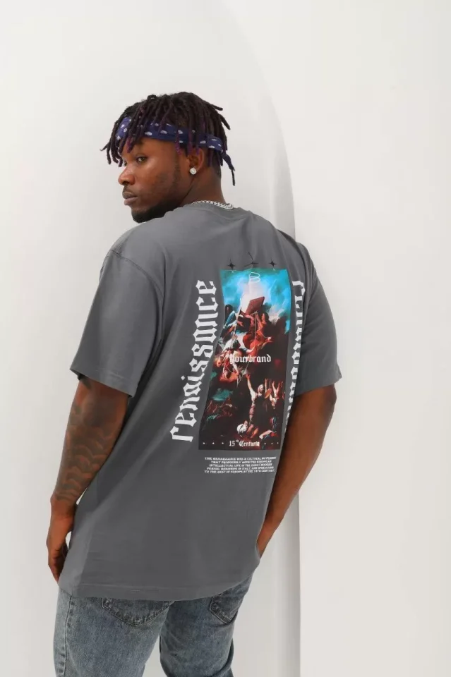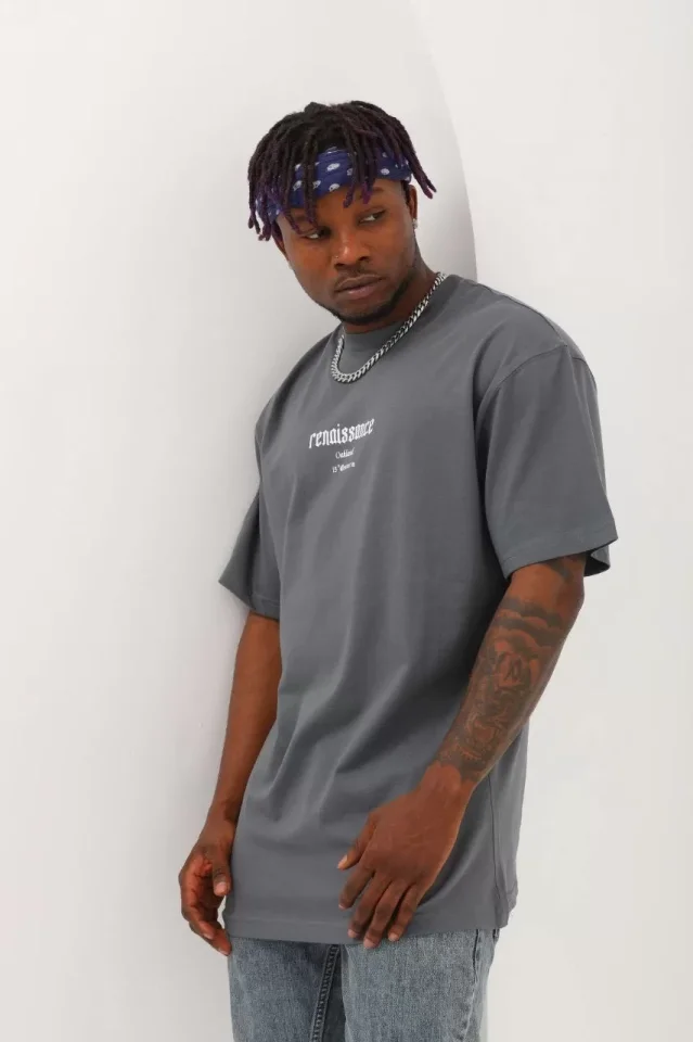 Unisex Oversize Baskılı Bisiklet Yaka T-Shirt – Füme