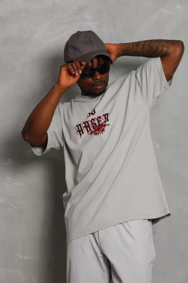 Unisex Oversize Baskılı Bisiklet Yaka T-Shirt – Gri