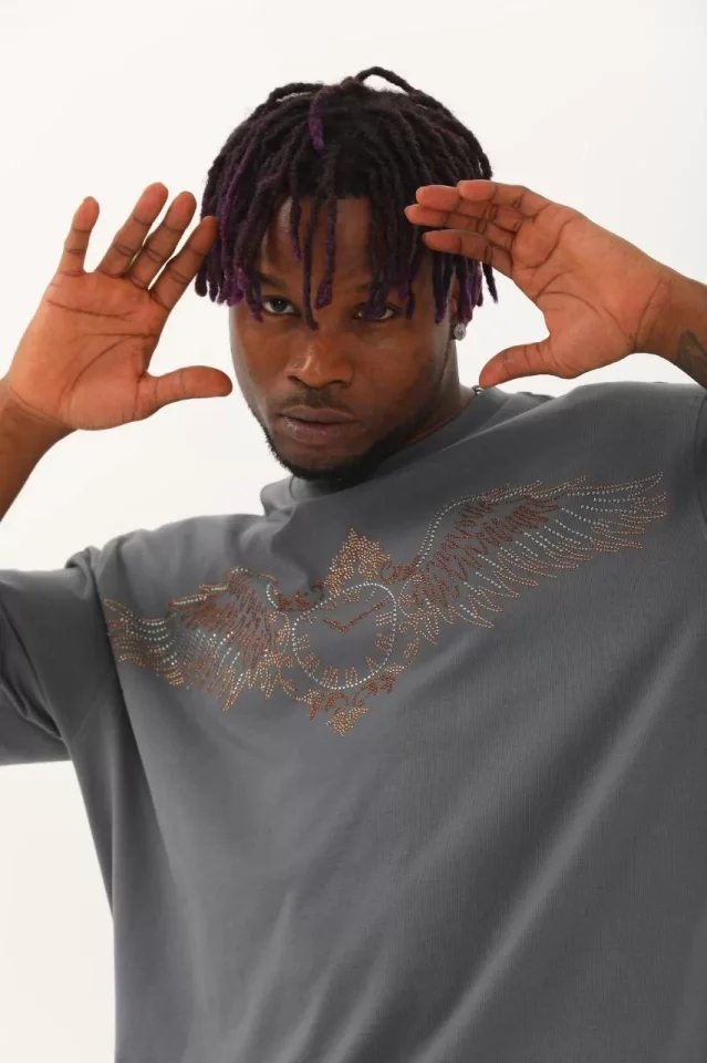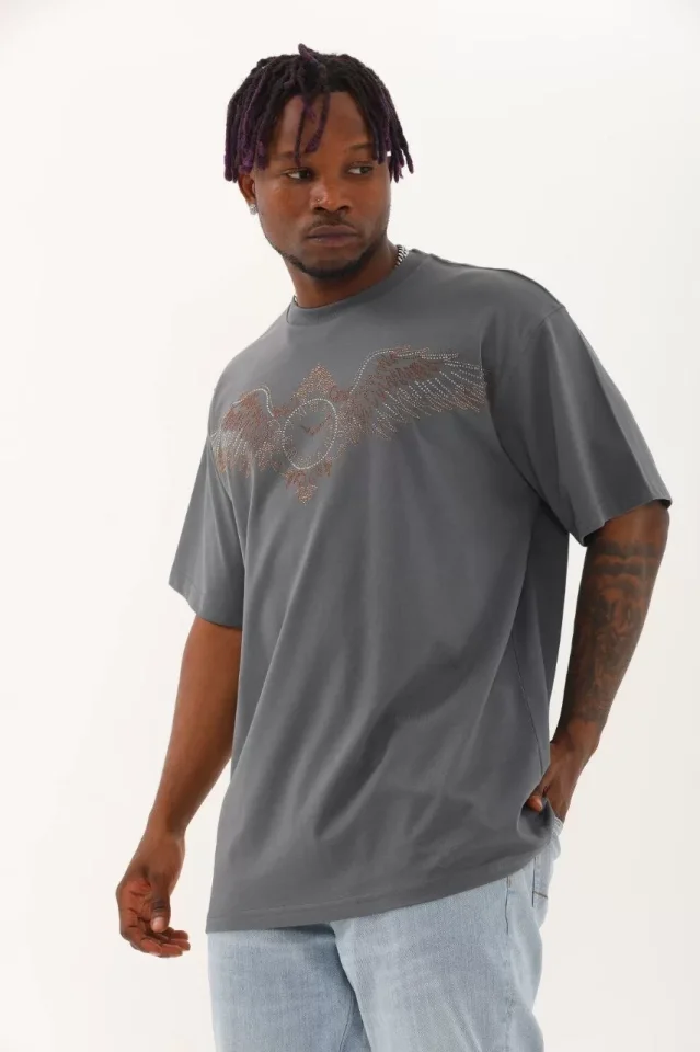 Unisex Oversize Taşlı Bisiklet Yaka T-Shirt – Füme