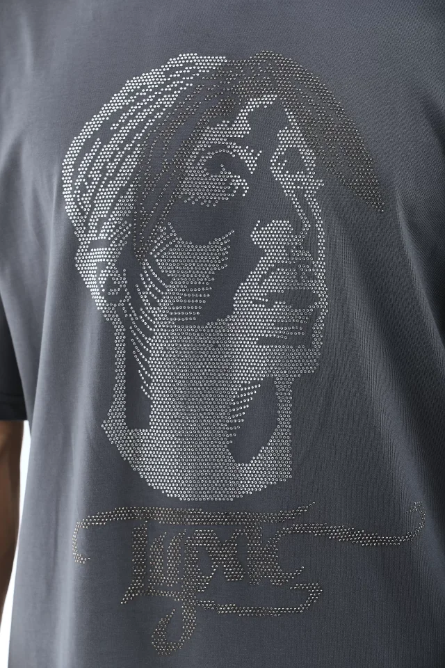 Unisex Oversize Taşlı Bisiklet Yaka T-Shirt – Füme