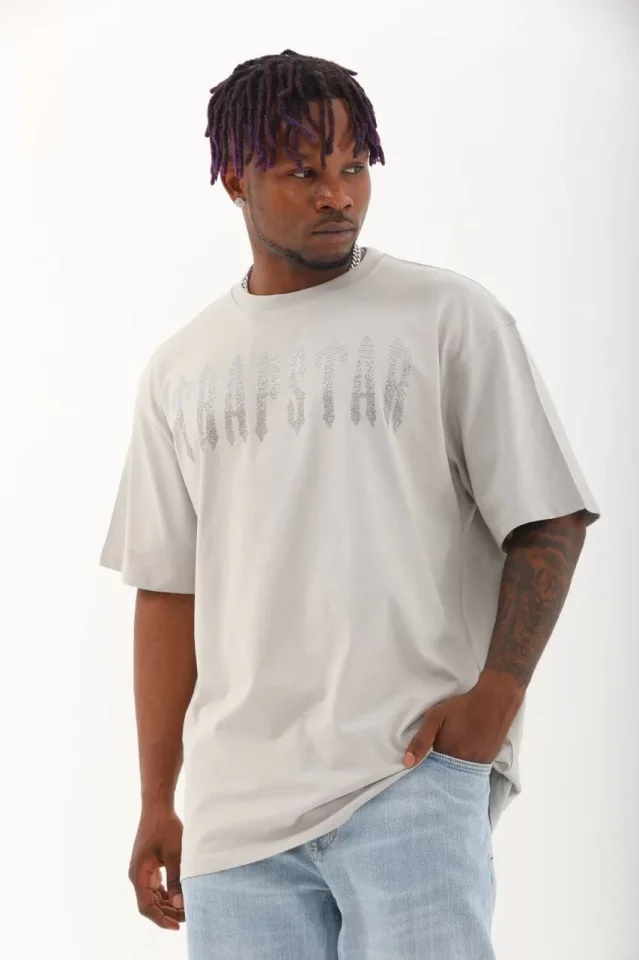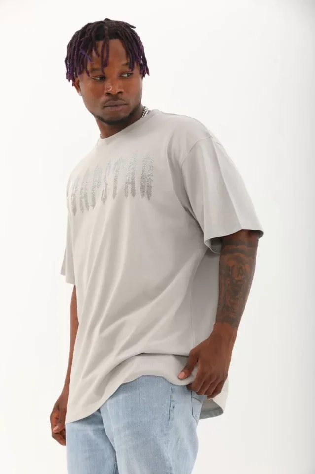 Unisex Oversize Taşlı Bisiklet Yaka T-Shirt – Gri