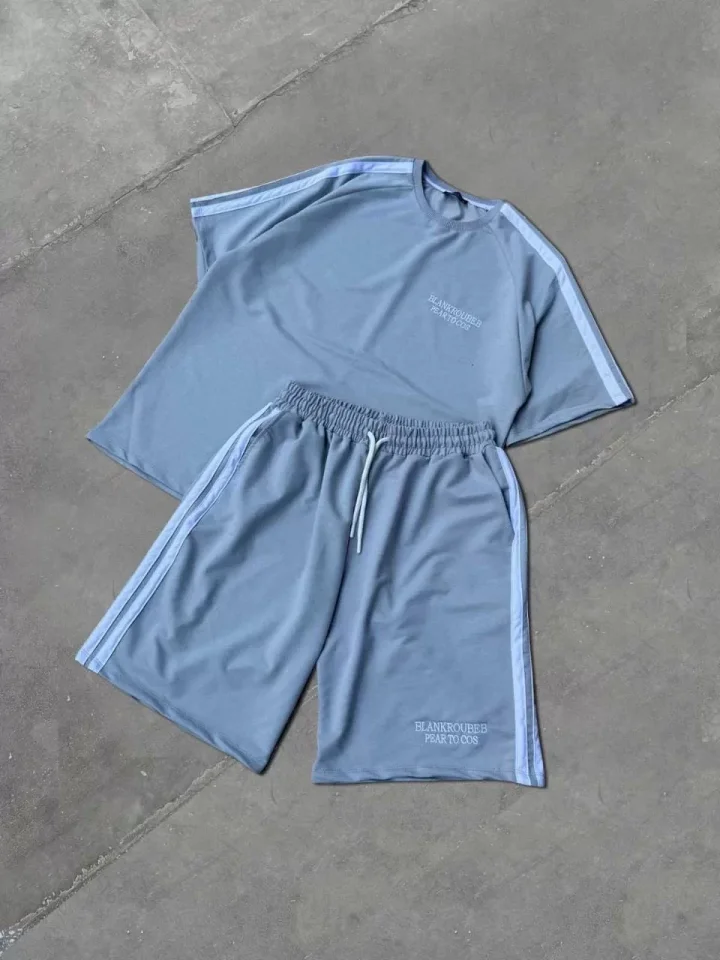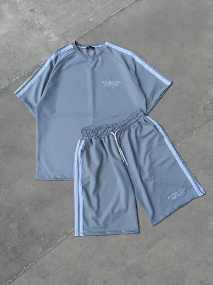 Unisex Şeritli Baskılı Şortlu Takım – Boyalı Gri