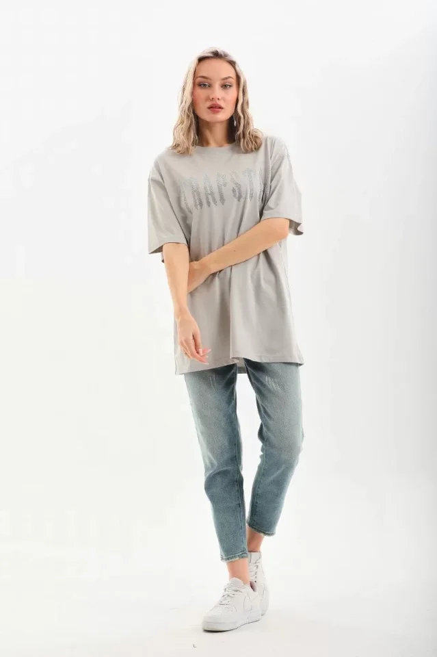 Unisex Taş Desenli Oversize T-Shirt – Gri