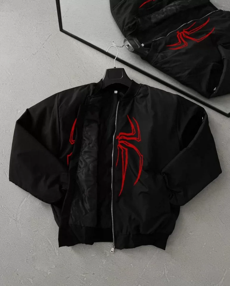 Unisex Uzun Kol Örümcek Baskılı Bomber Ceket – Siyah