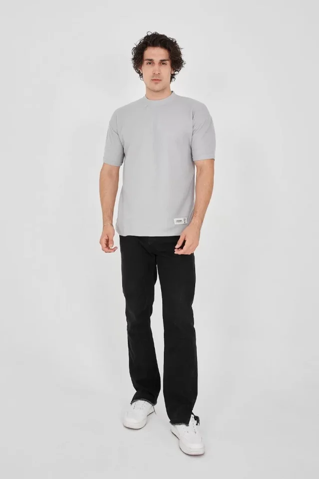 Unisex Waffle Kumaş Rahat Kol T-Shirt – Boyalı Gri
