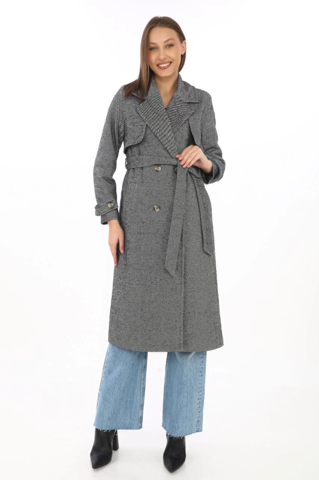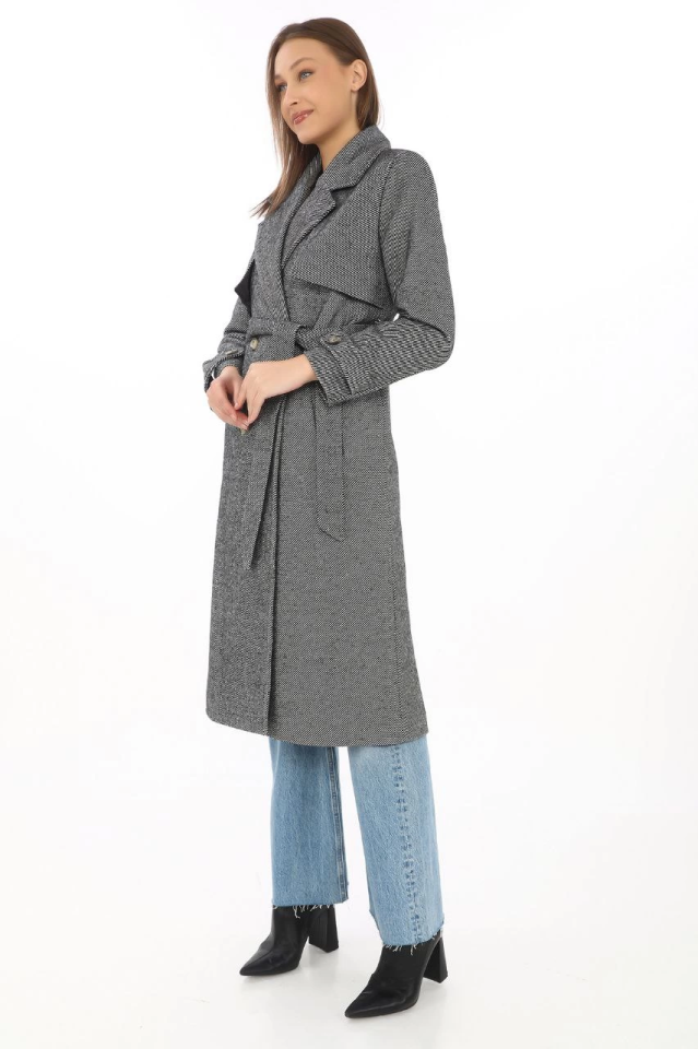 Uzun Kaşe Kaban – Balık Sırtı Dokuma Kaşmir Kumaş, Kruvaze Yaka, Kuşaklı Cepli Model, Oversize Rahat Kalıp – Boyalı Gri