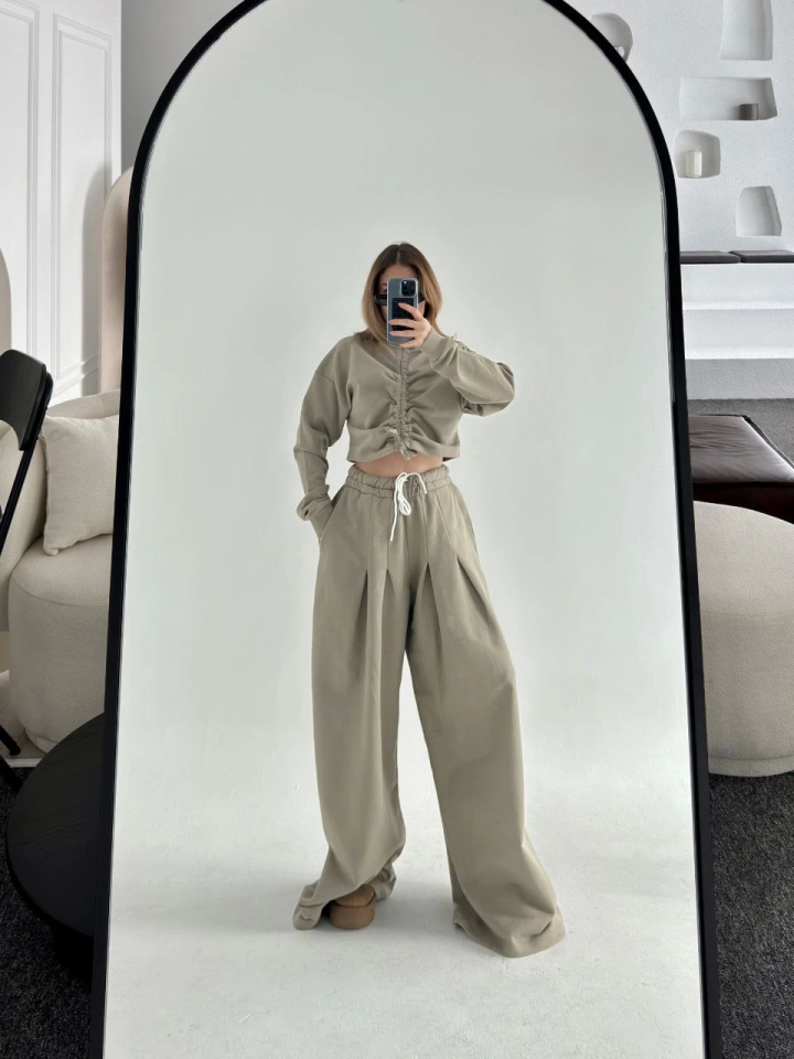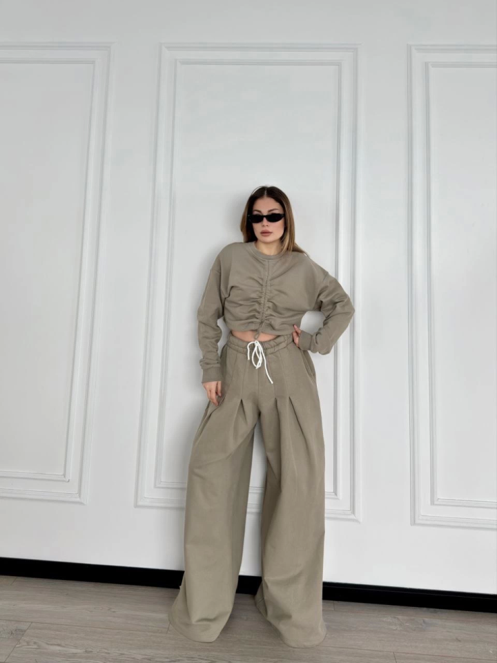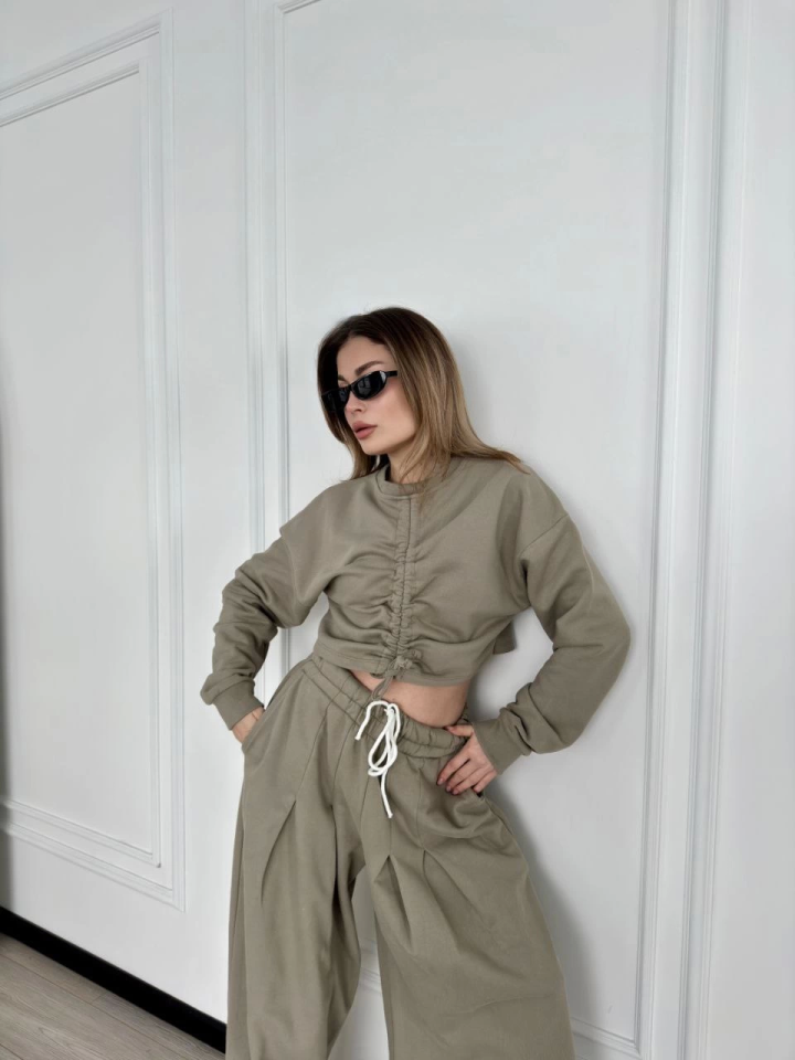 Uzun Kollu Önü İp Büzgülü Crop Ve Pantolon İkili Takım – Haki