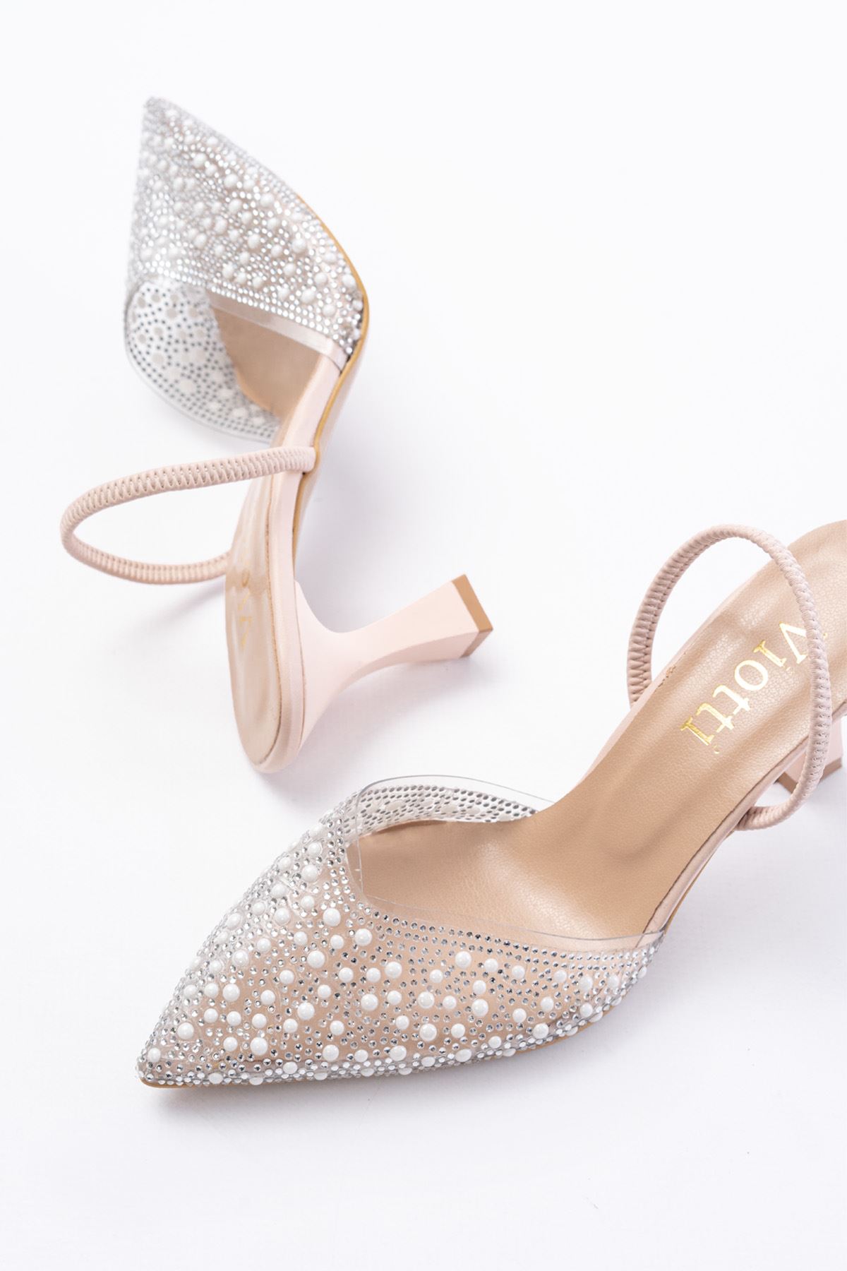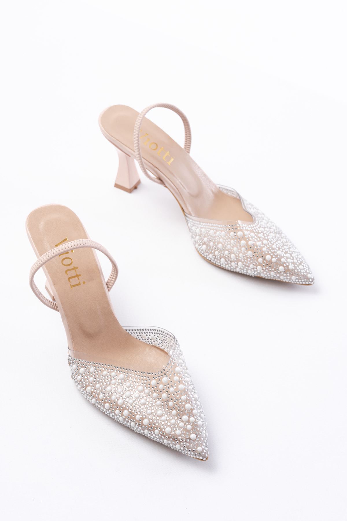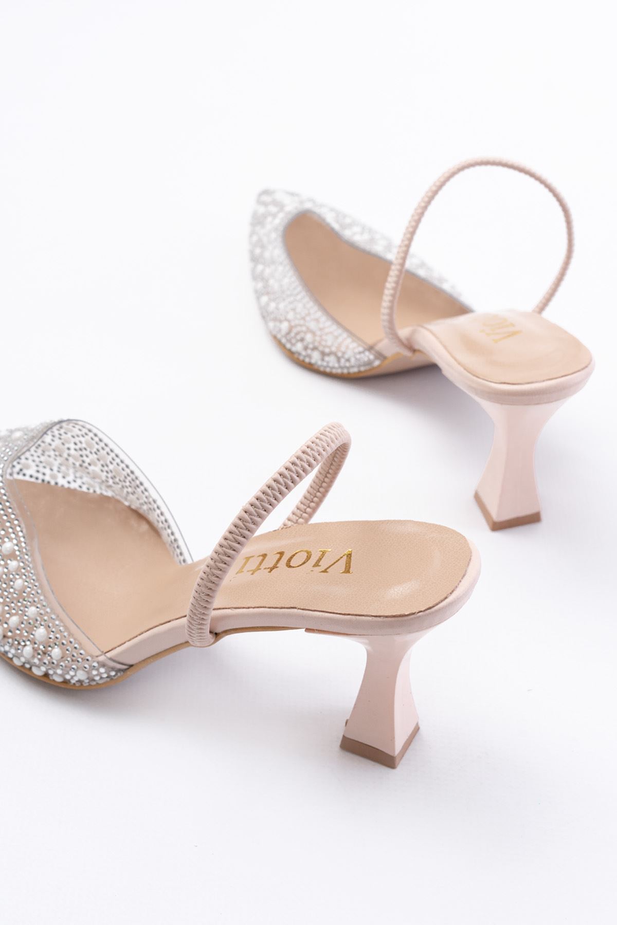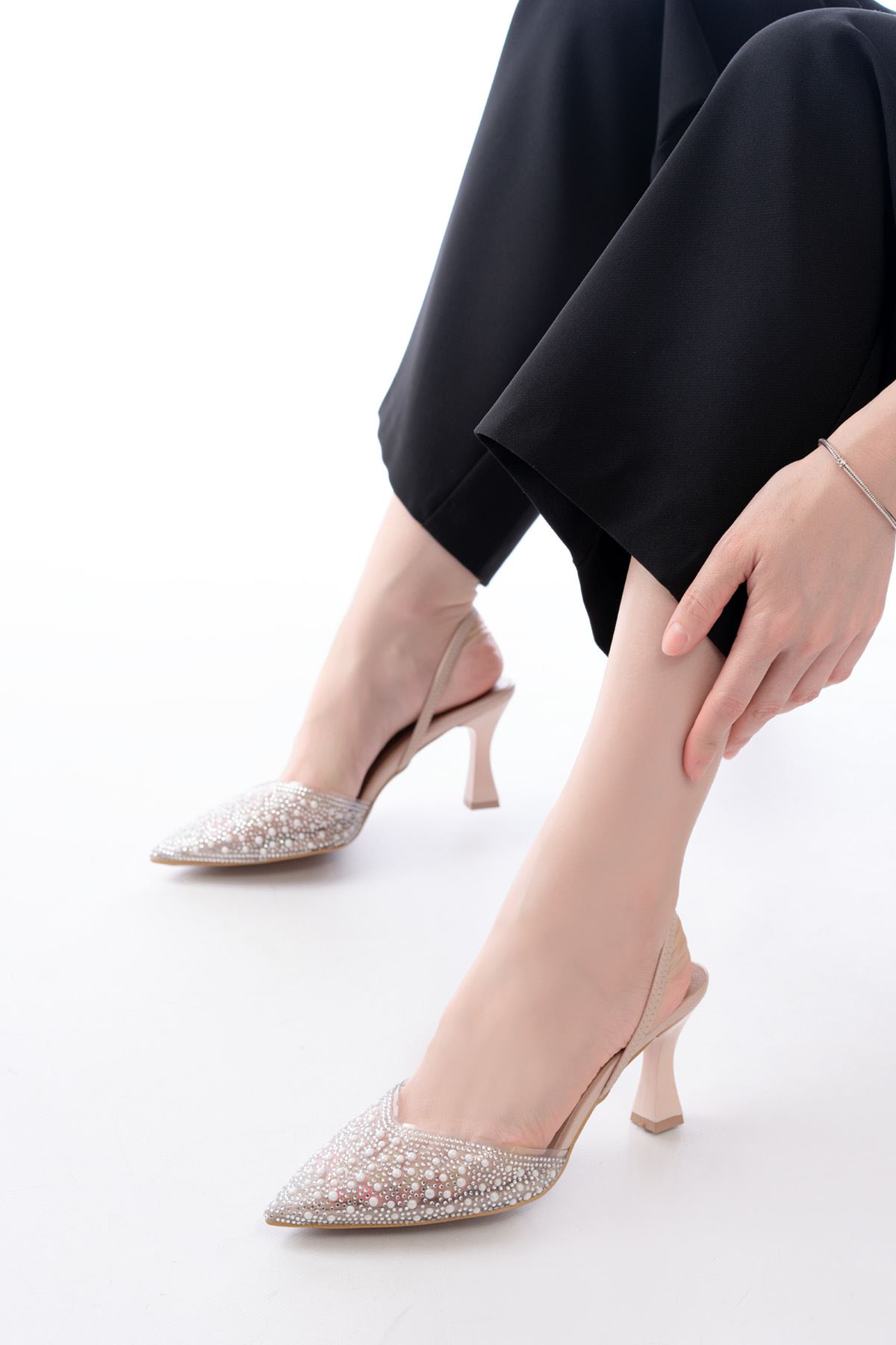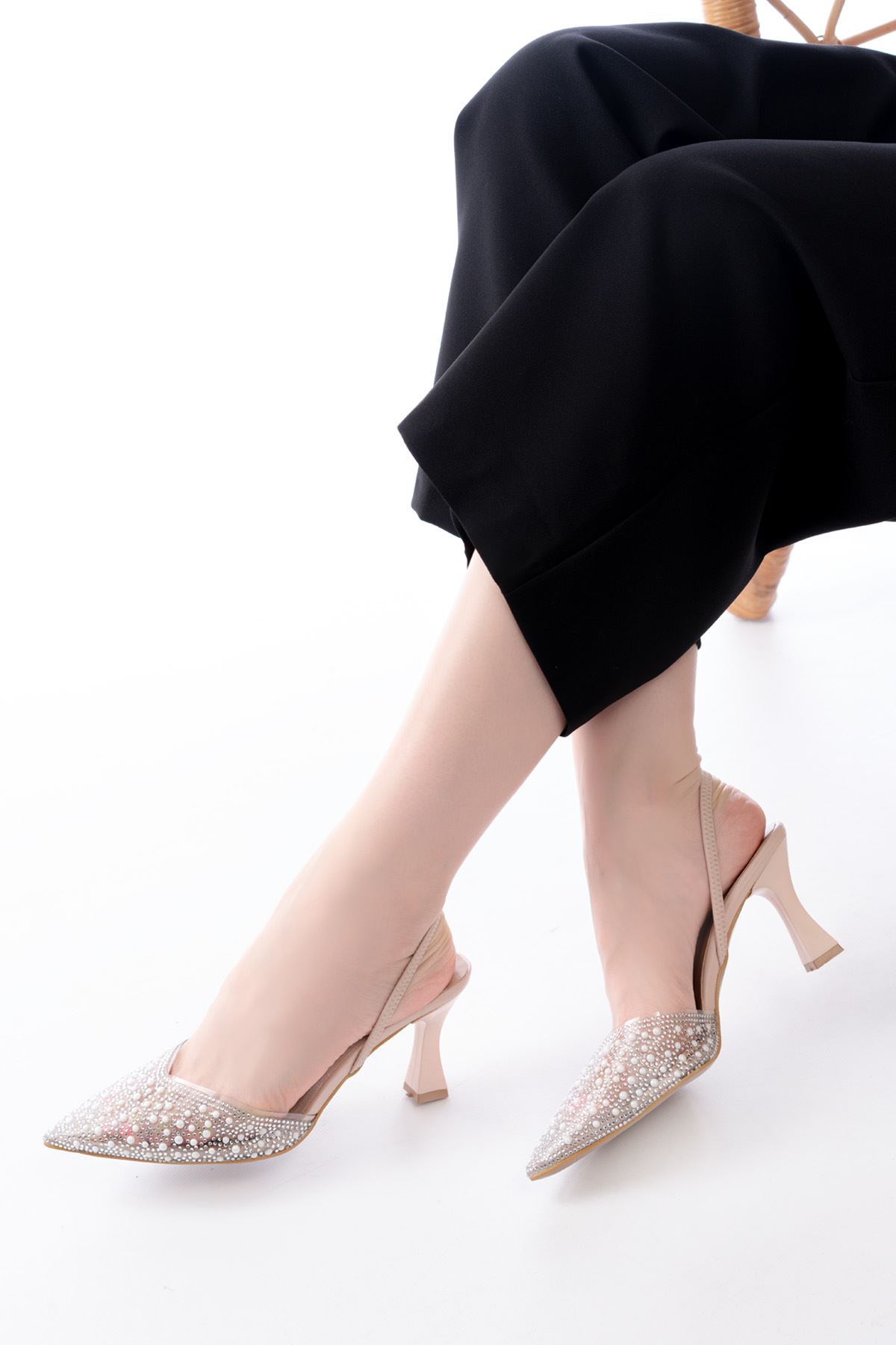 V-1005 Bej Günlük Arkası Açık Taşlı Topuklu Bayan Ayakkabı