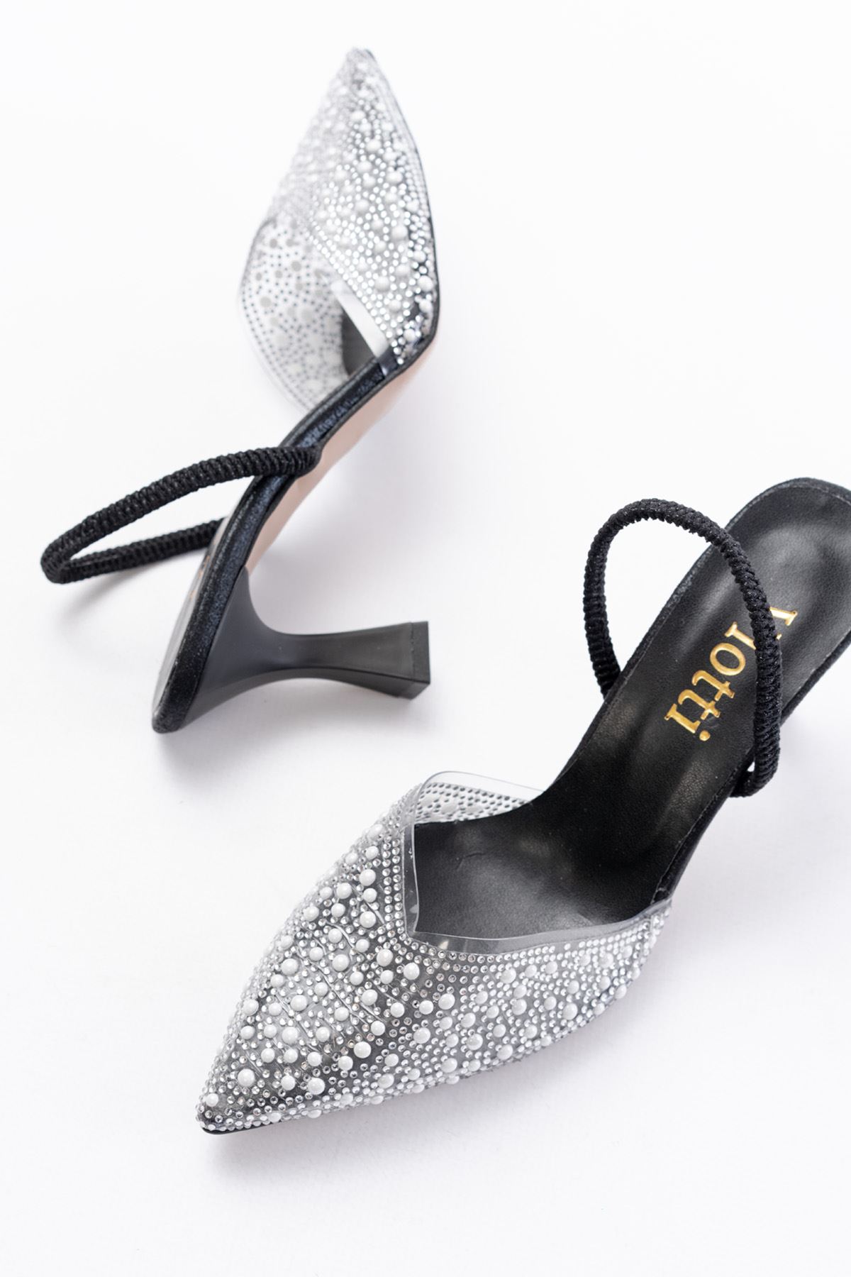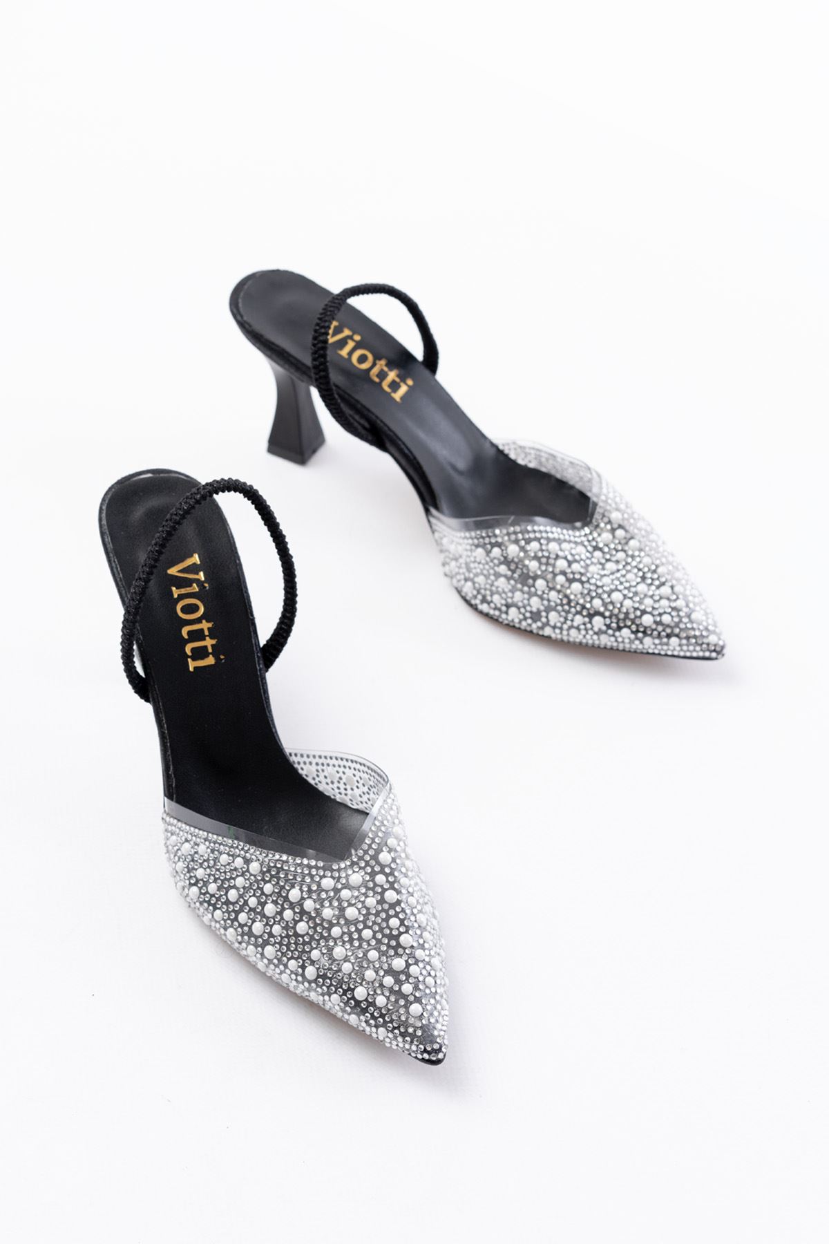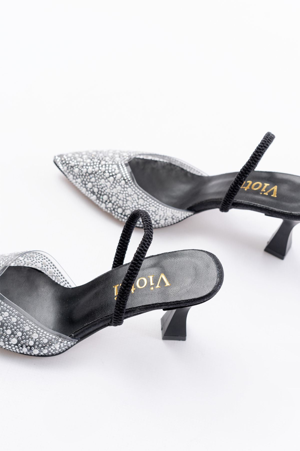 V-1005 Siyah Günlük Arkası Açık Taşlı Topuklu Bayan Ayakkabı