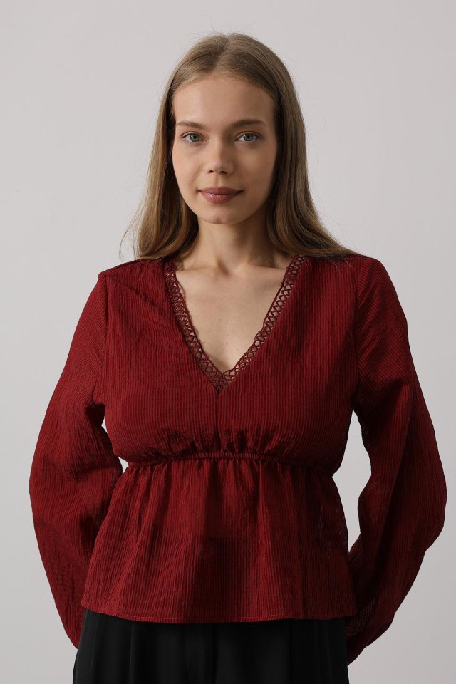V Yaka Dantelli Bluz – Bordo
