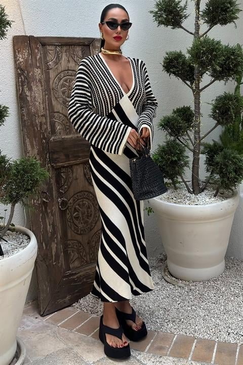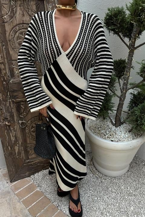 Verev Çizgi Kombinli V Yaka Elbise 2846