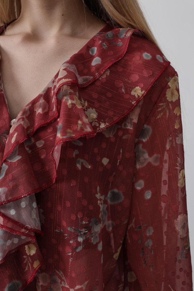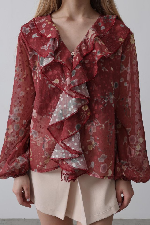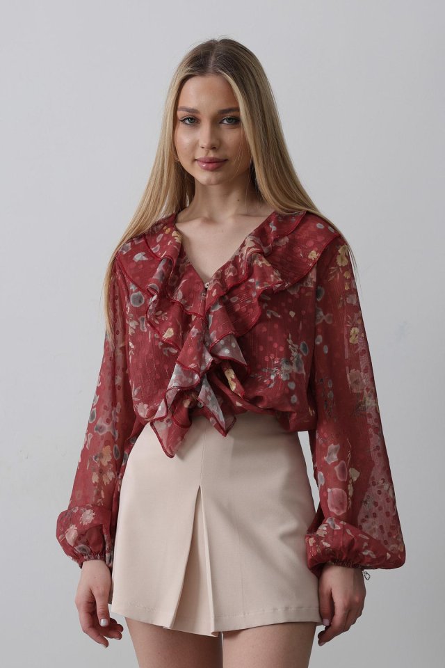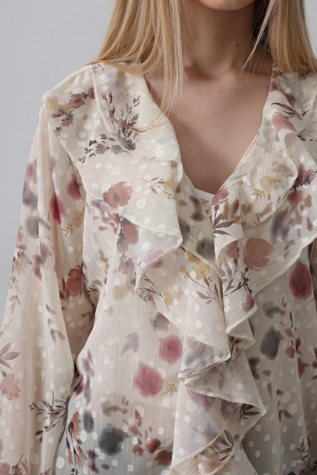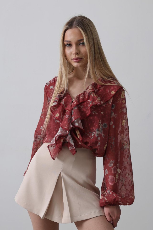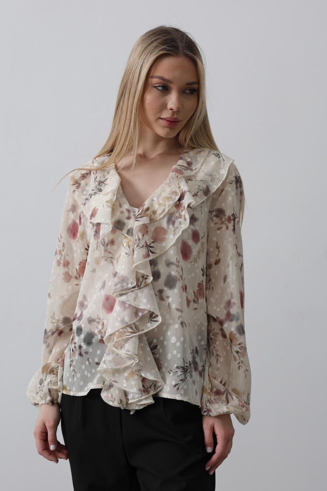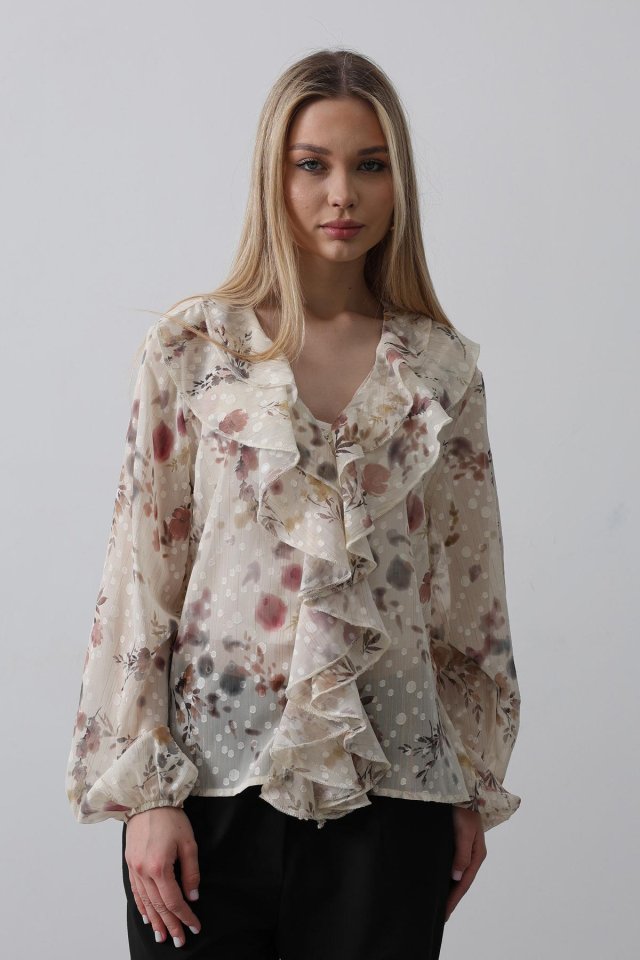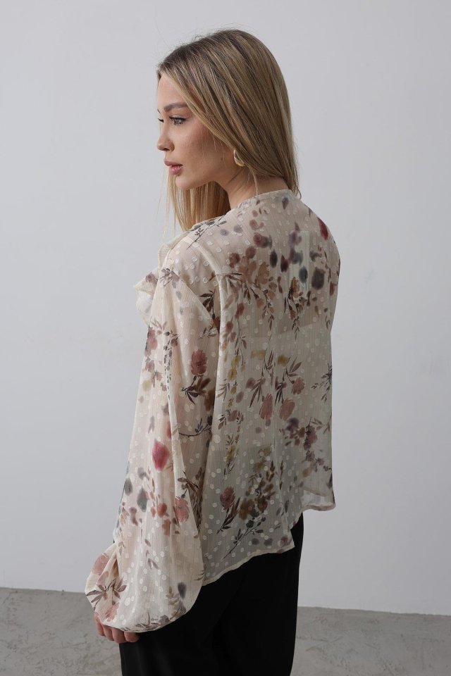 Volanlı Çiçek Desen Şifon Gömlek – Krem