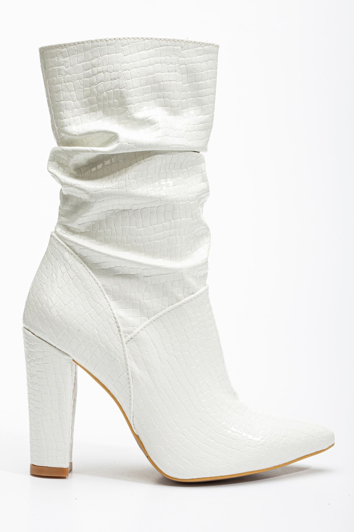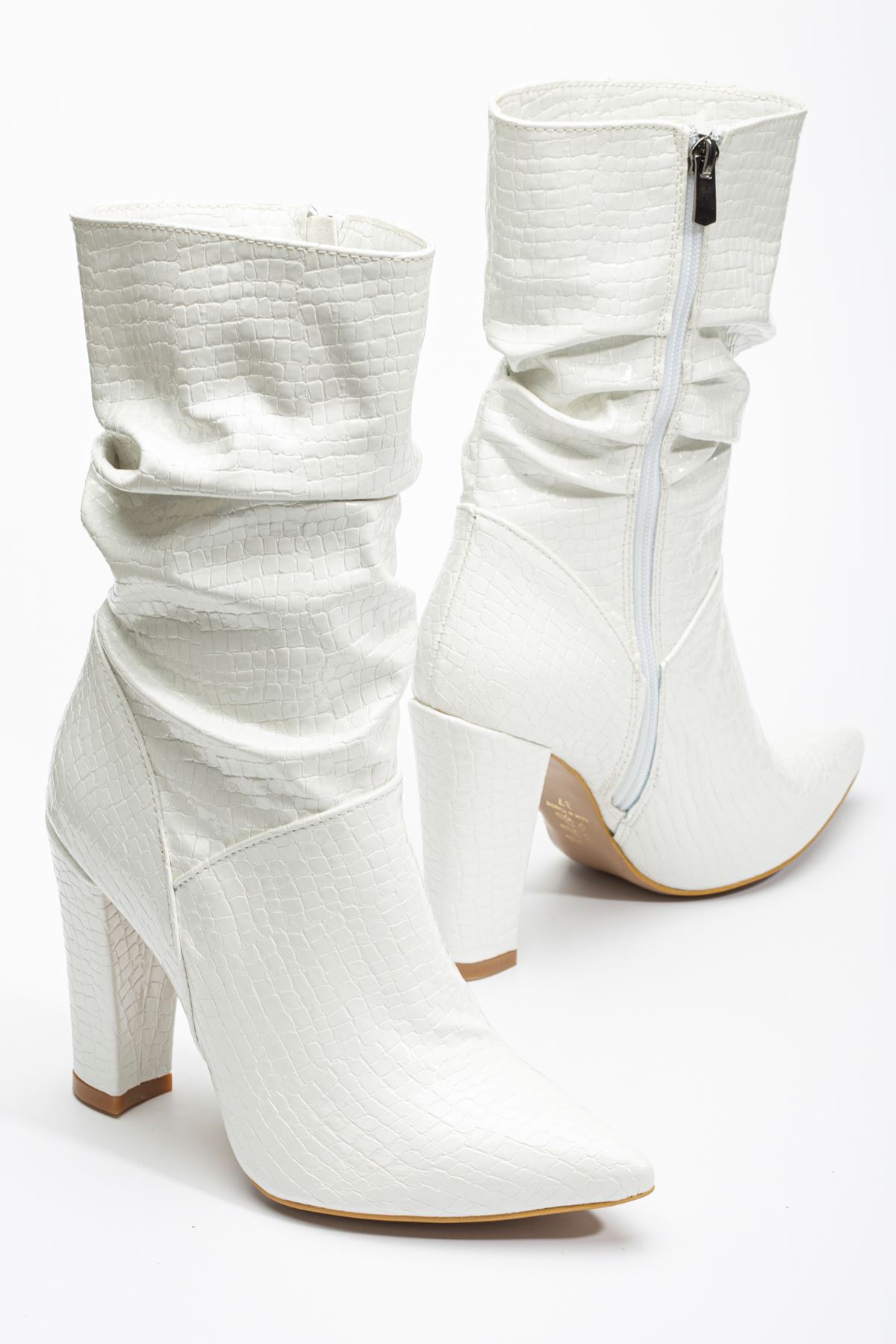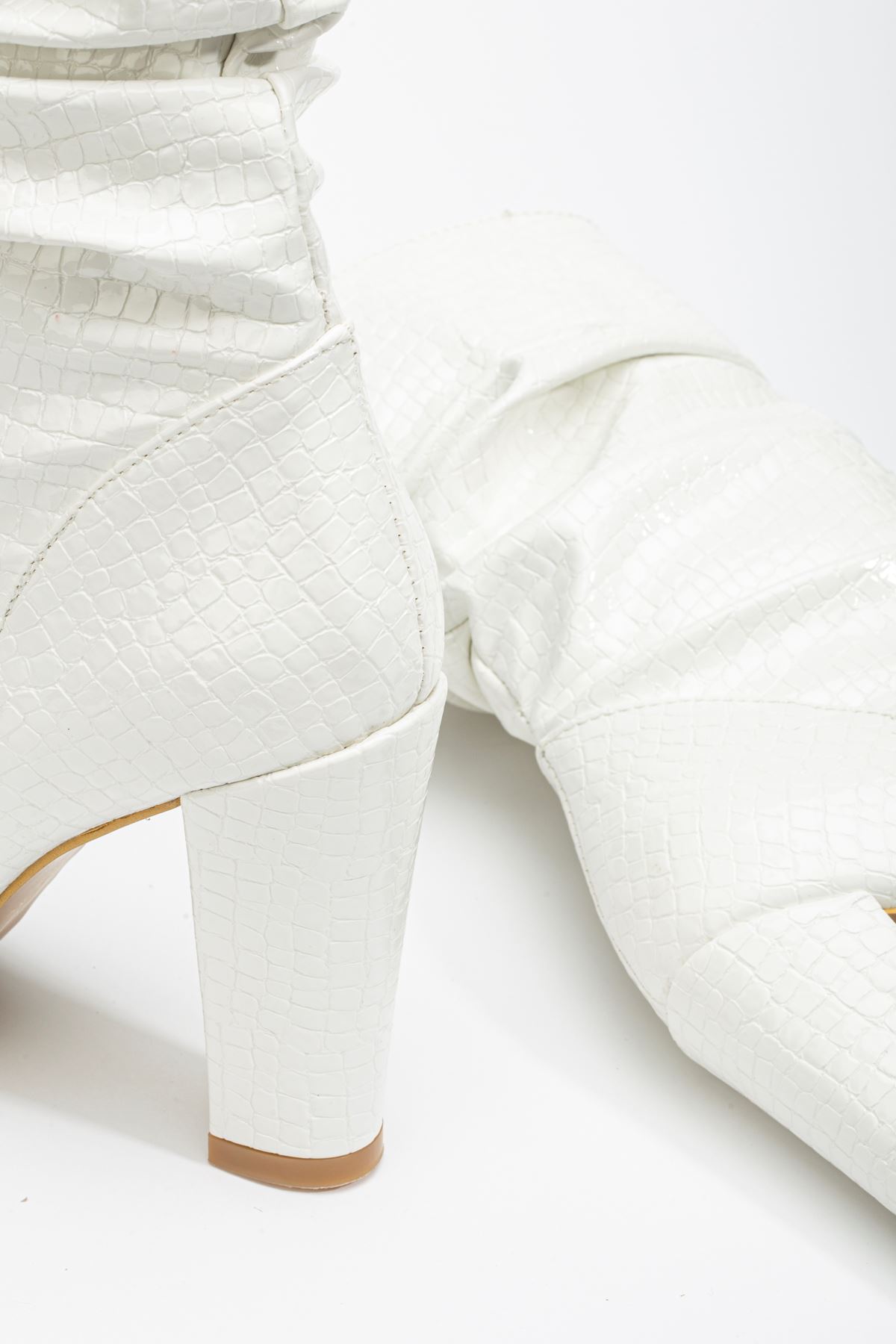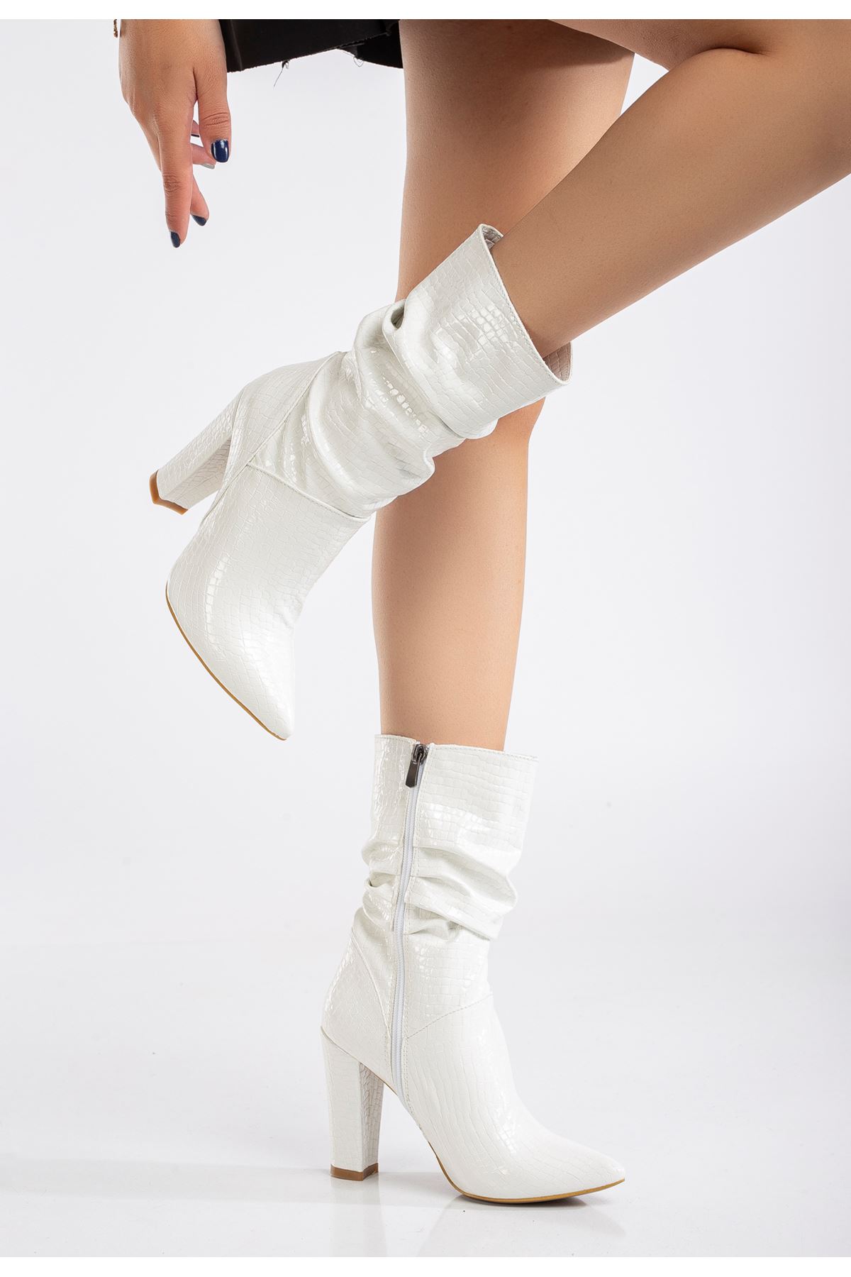 VRT-4815 Beyaz Kroko Yüksek Kalın Topuklu Körüklü Fermuarlı Kadın Bot
