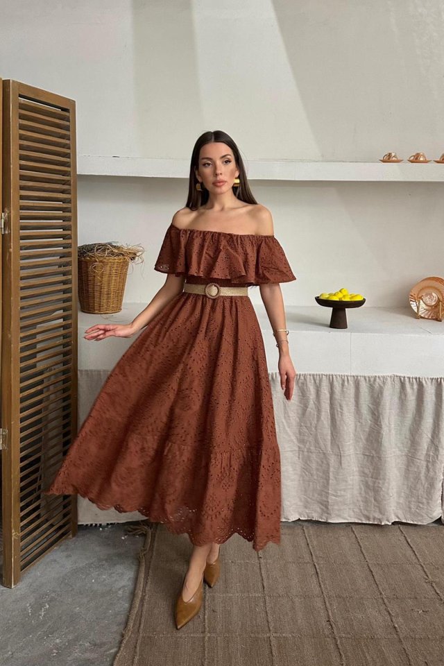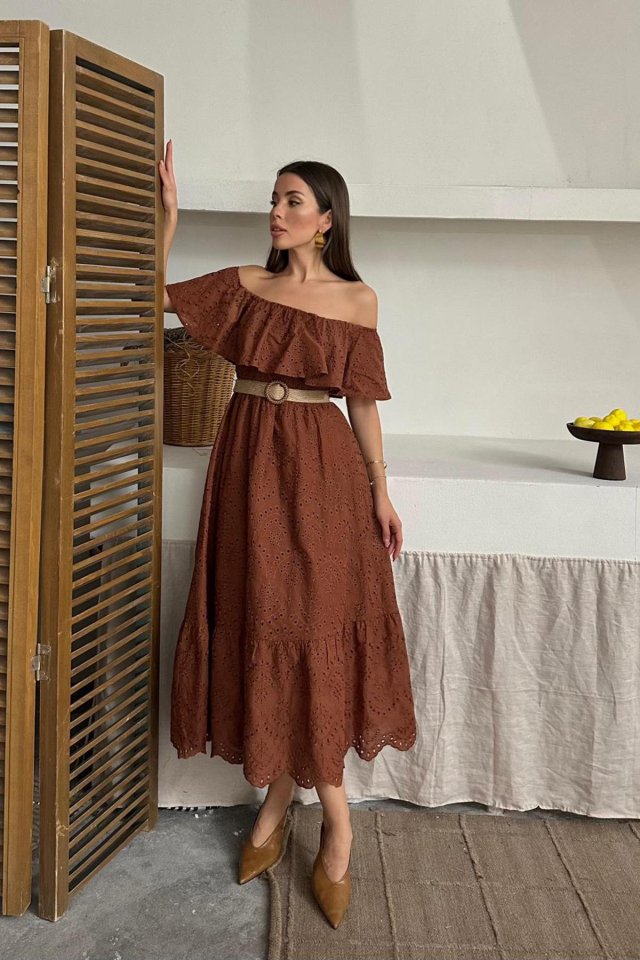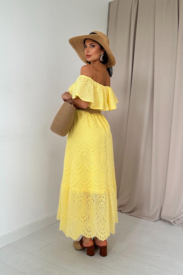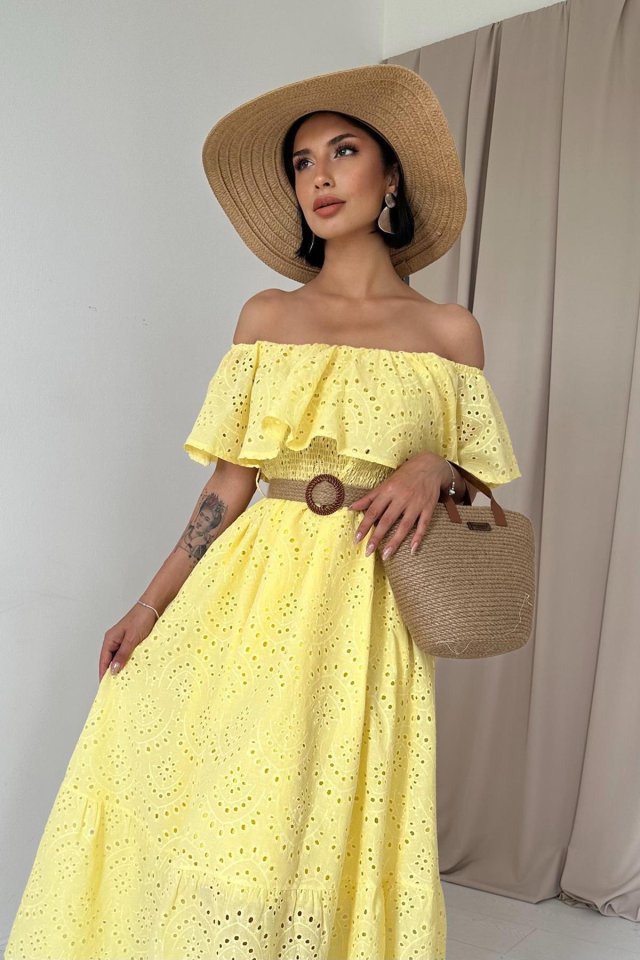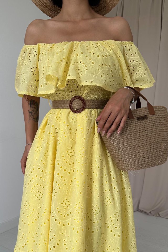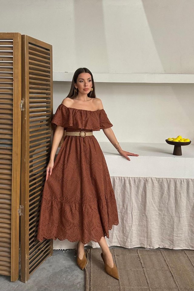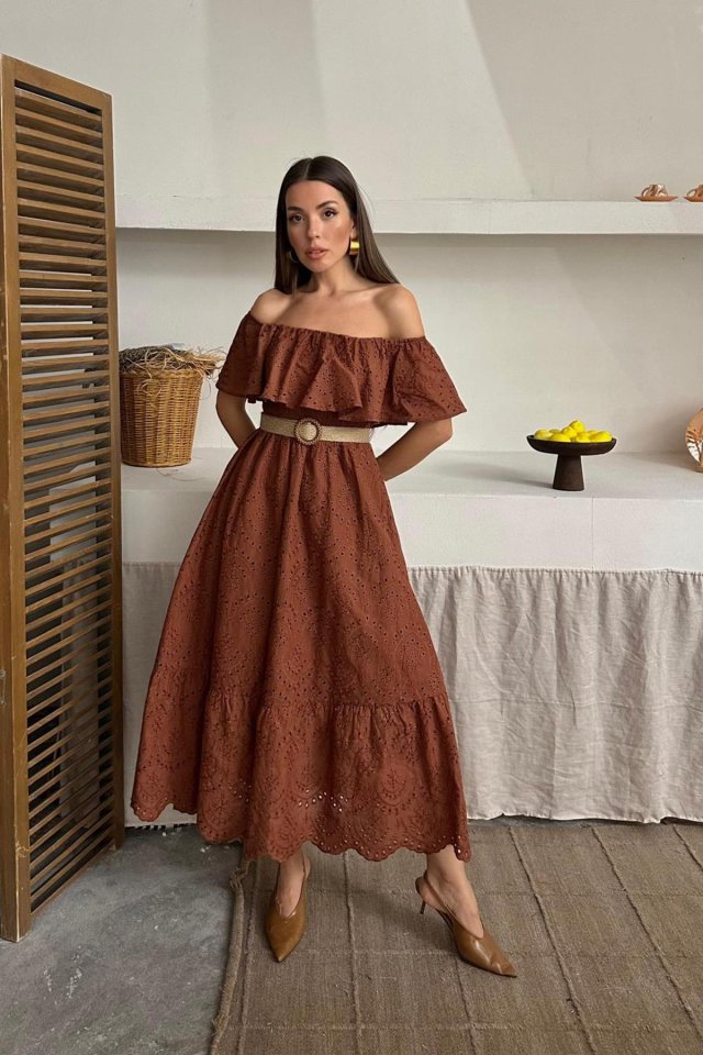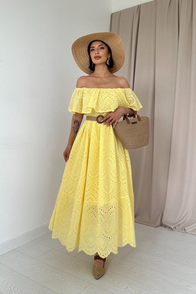 Yağ Yeşili Omzu Lastikli Brode Elbise
