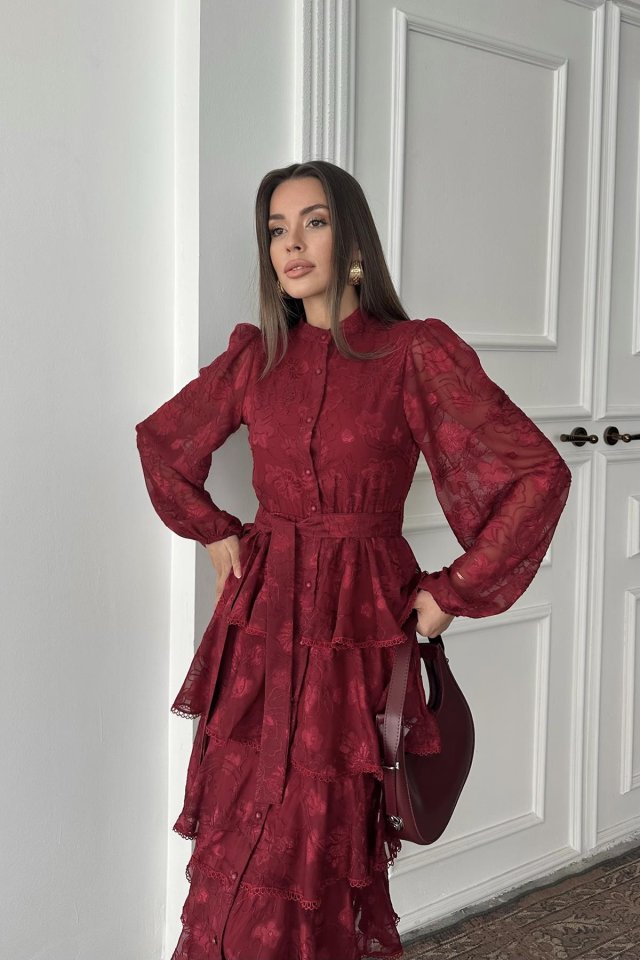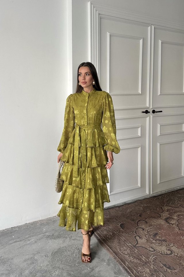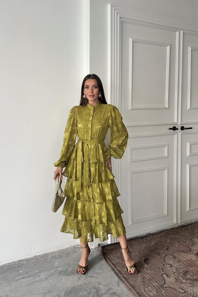 Yağ Yeşili Valonlu Şeritli Kat Kat Elbise