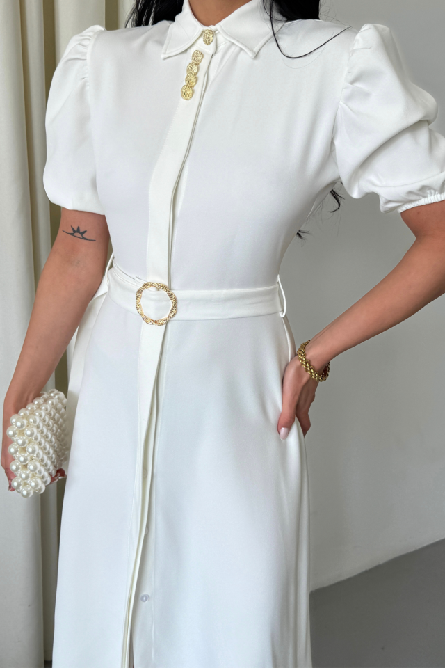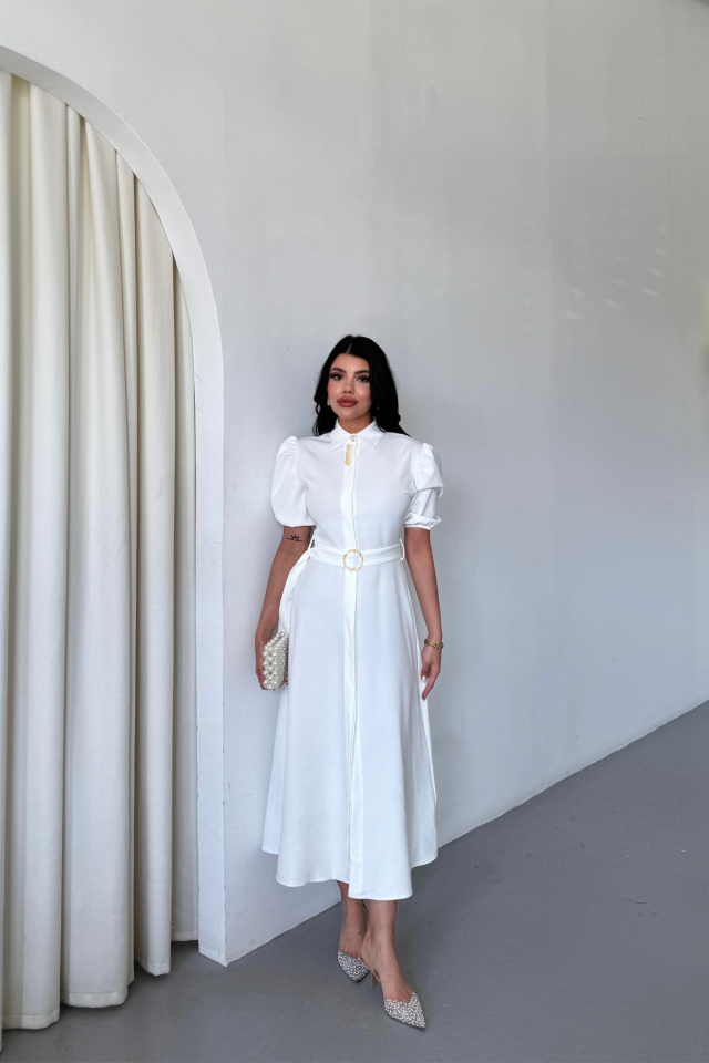 YAKA DÜĞME DETAYLI ELBİSE – Beyaz