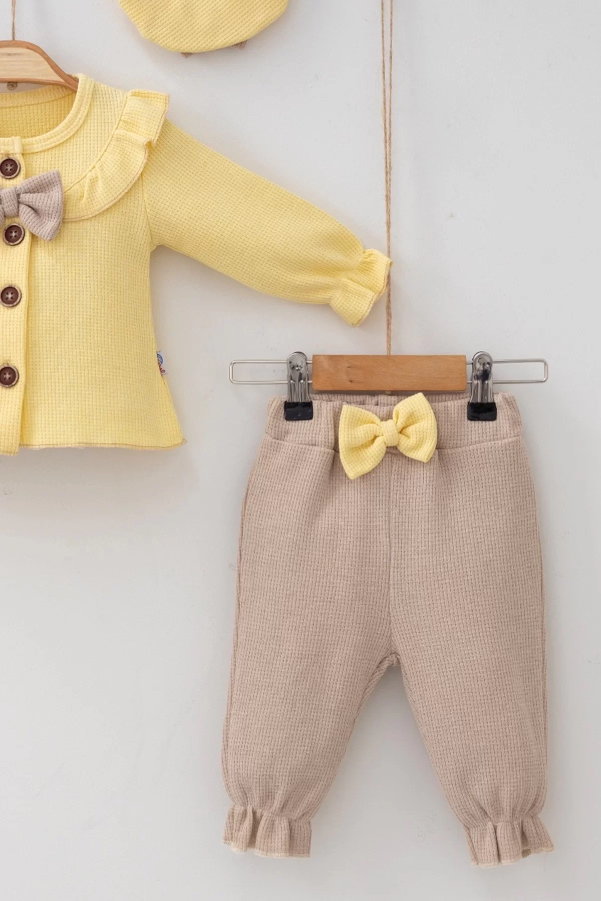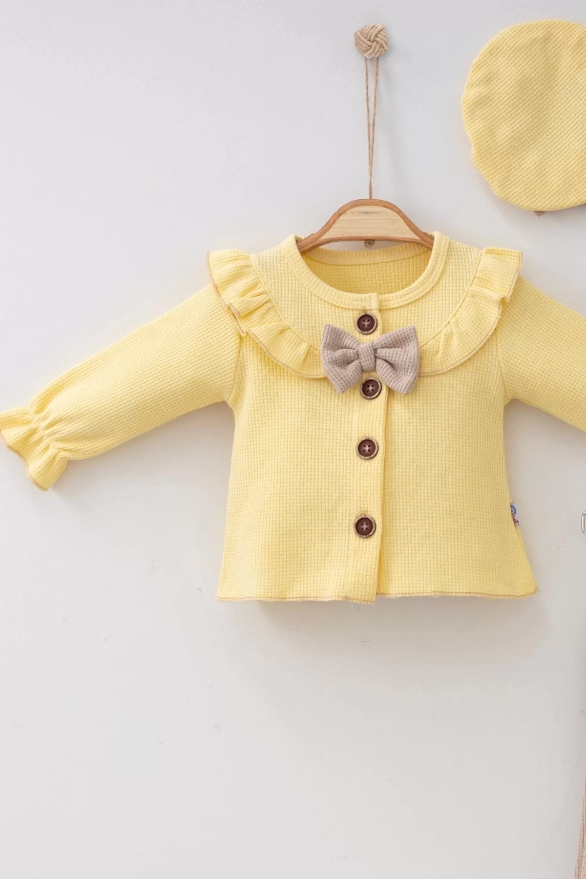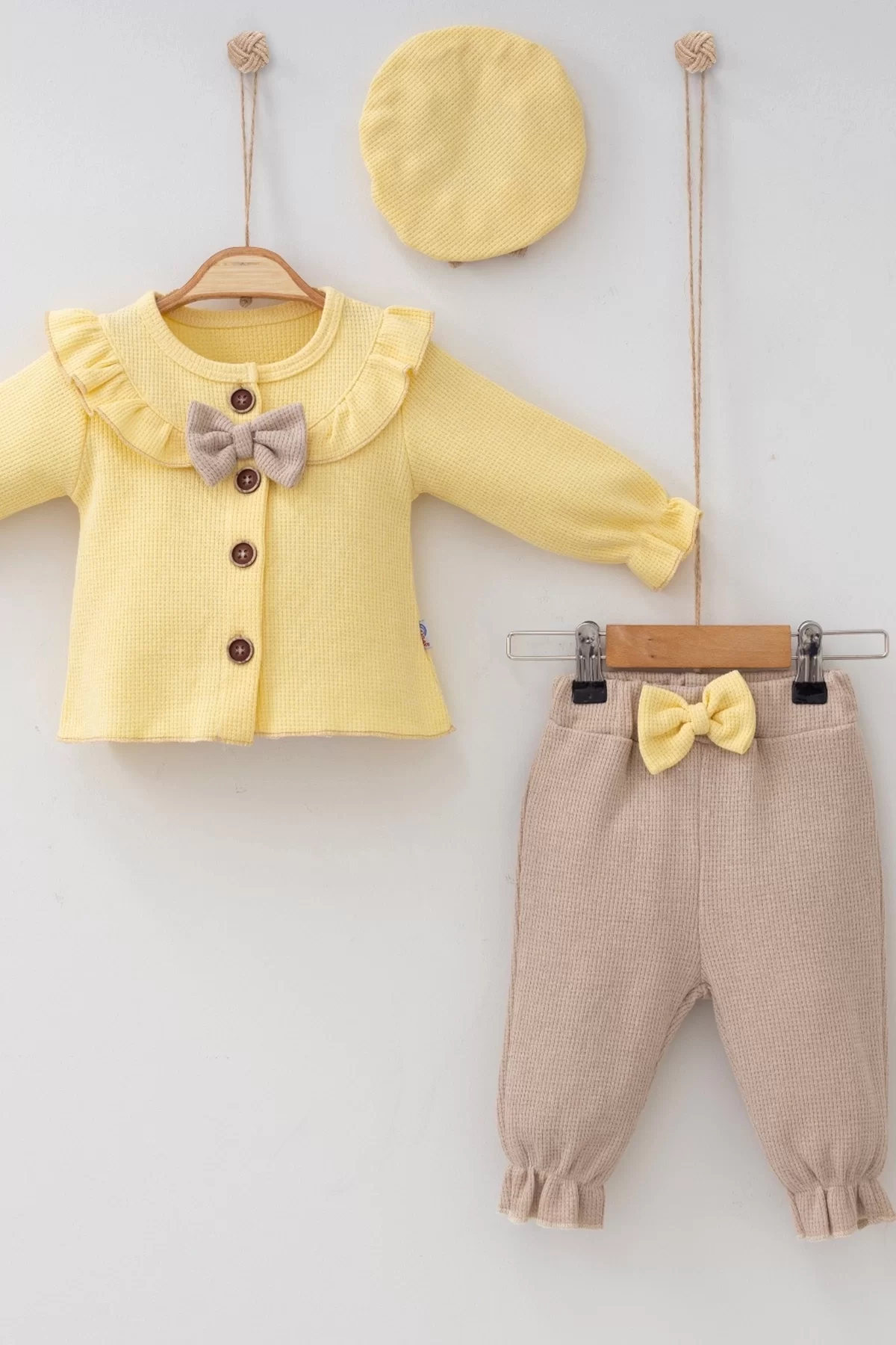 Yaka Fırfırlı Şapkalı 3’lü Kız Bebek Takımı