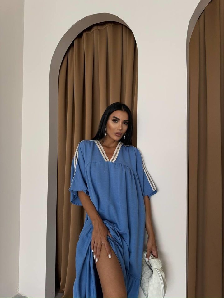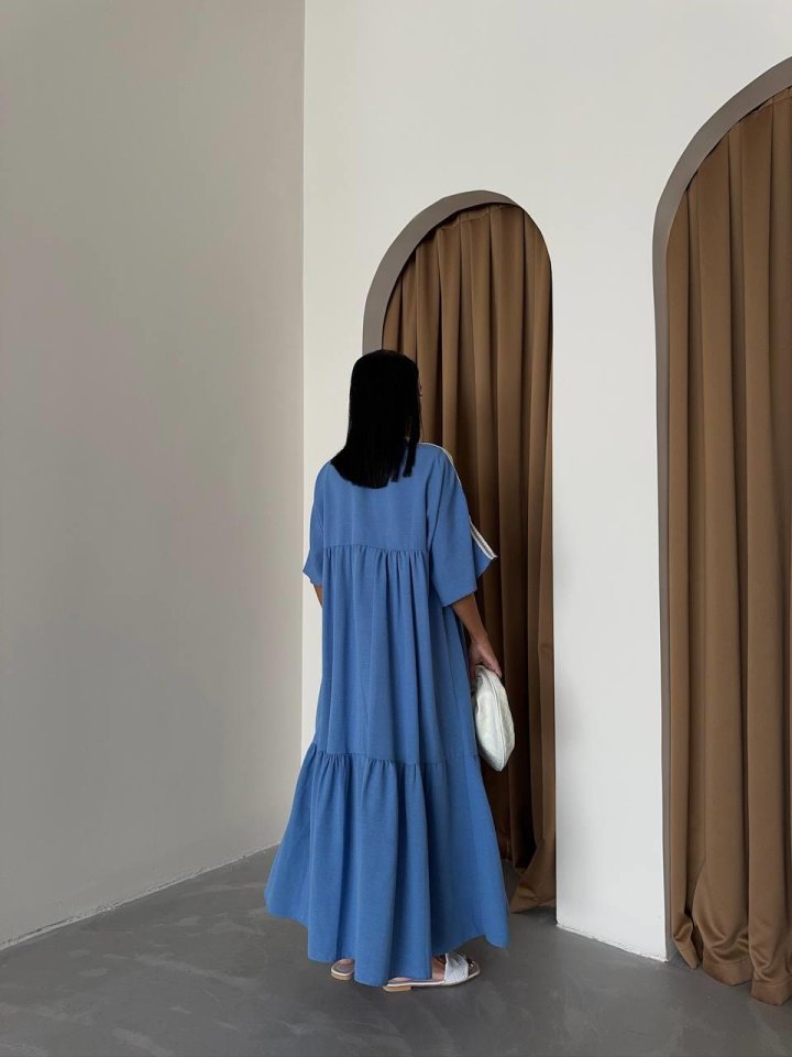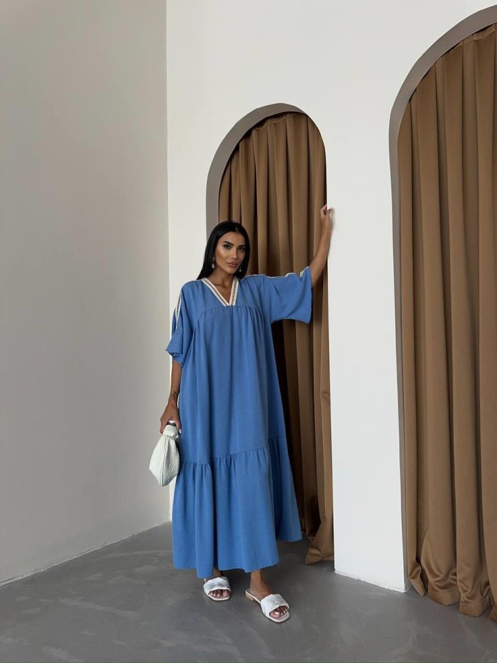 YAKA-KOL HASIR BİYE ŞERİTLİ KETEN SALAŞ ELBİSE – Mavi