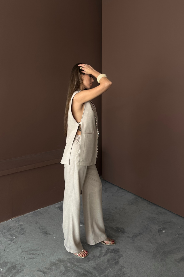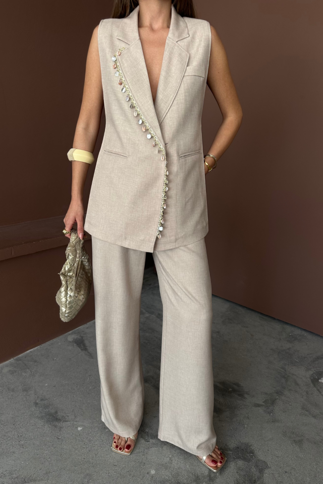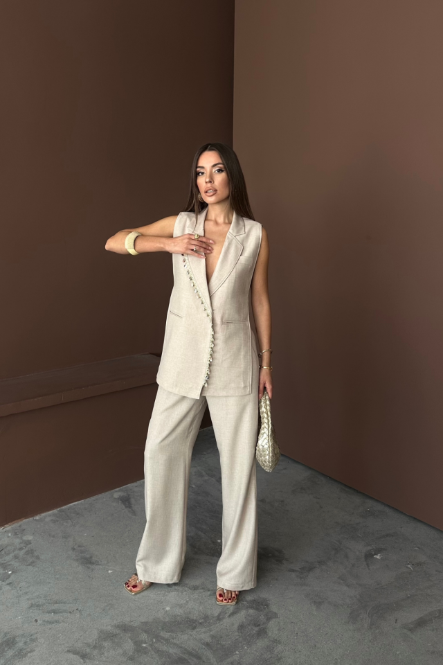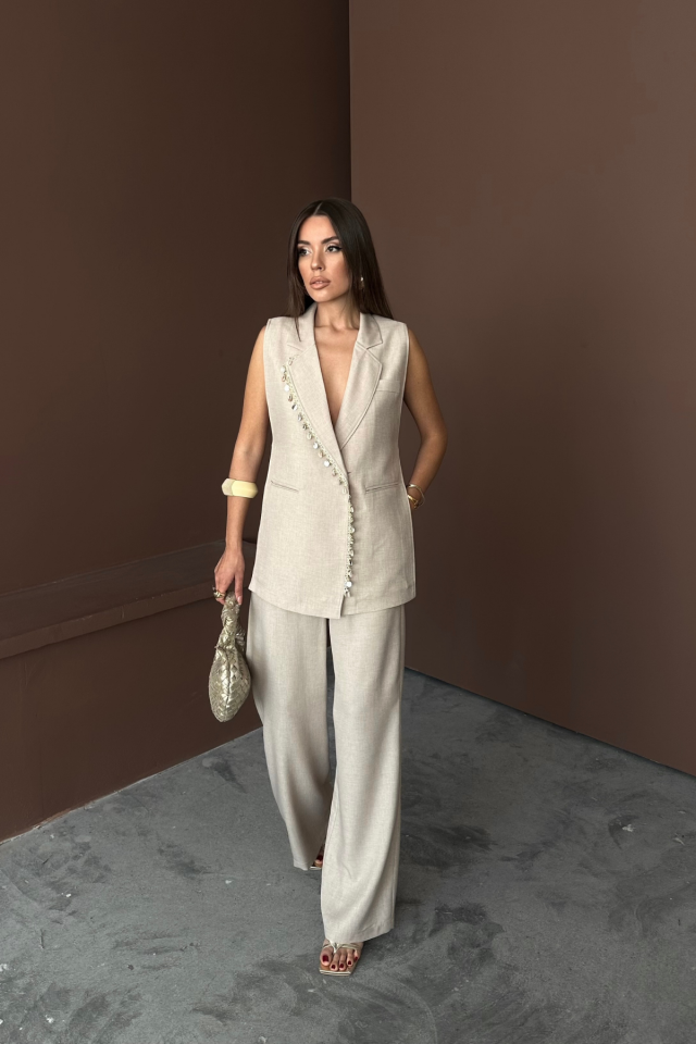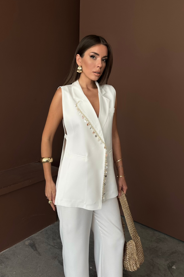 YAKA MİDYE KABUĞU SIRALI YELEK – PANTOLONTAKIM KETEN KUMAŞ – Beyaz