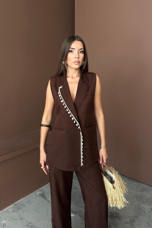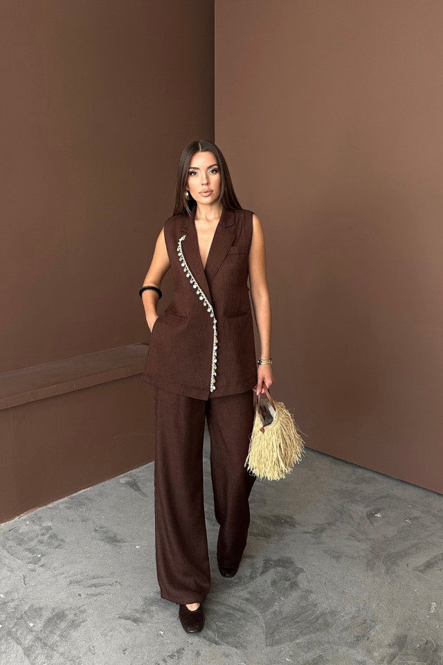 YAKA MİDYE KABUĞU SIRALI YELEK – PANTOLONTAKIM KETEN KUMAŞ – Kahverengi
