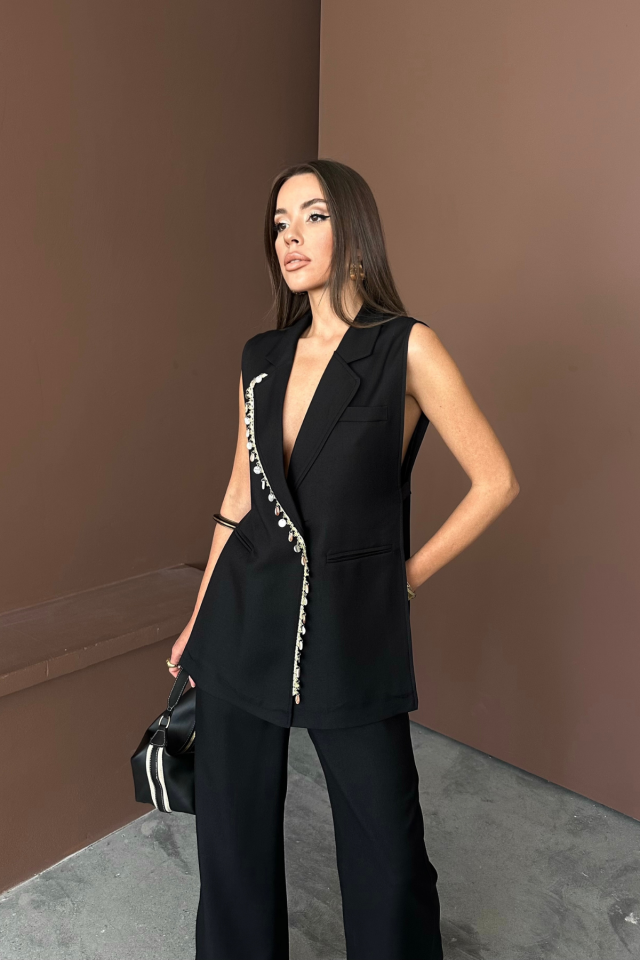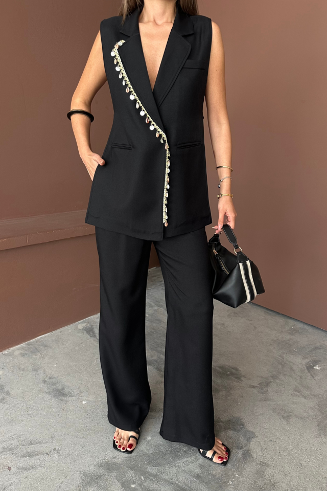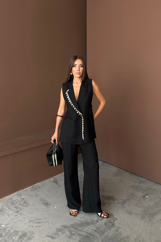 YAKA MİDYE KABUĞU SIRALI YELEK – PANTOLON TAKIM KETEN KUMAŞ – Siyah