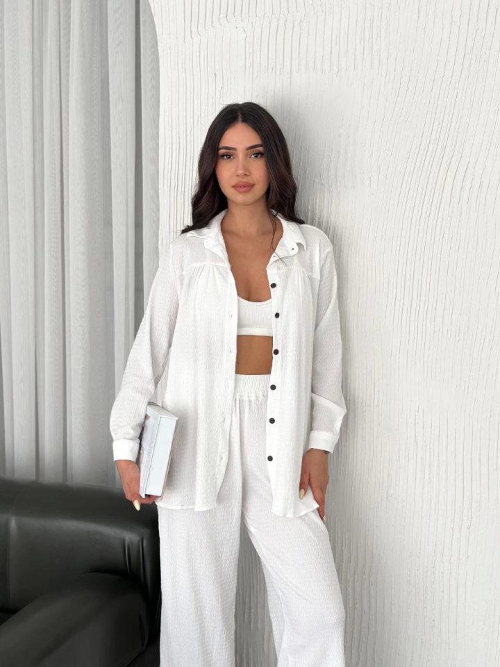 Yakalı Düğmeli Uzun Kollu Gömlek Pantolon Ikili Takım – Beyaz