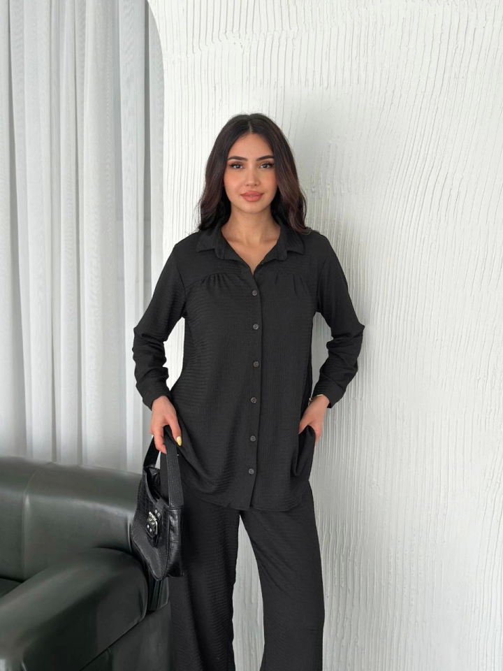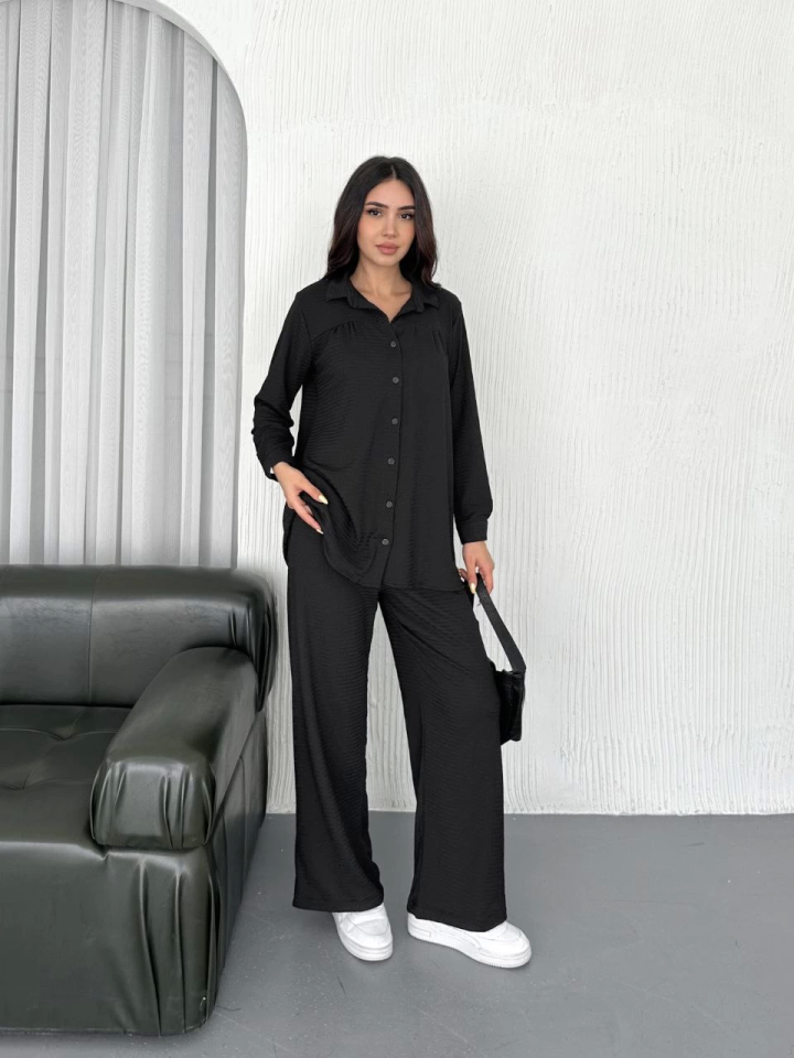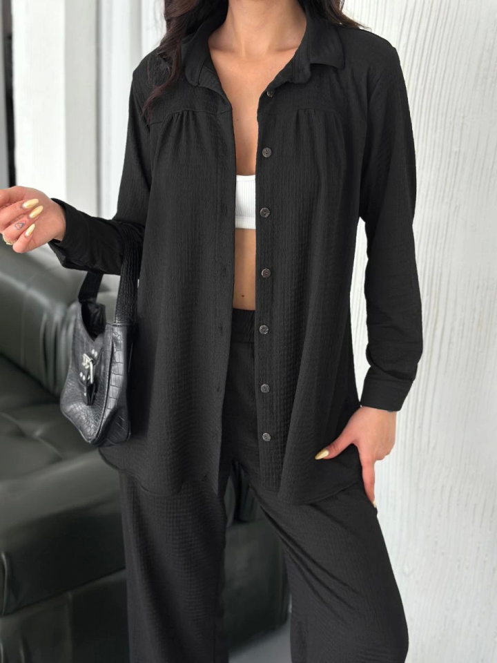 Yakalı Düğmeli Uzun Kollu Gömlek Pantolon Ikili Takım – Siyah