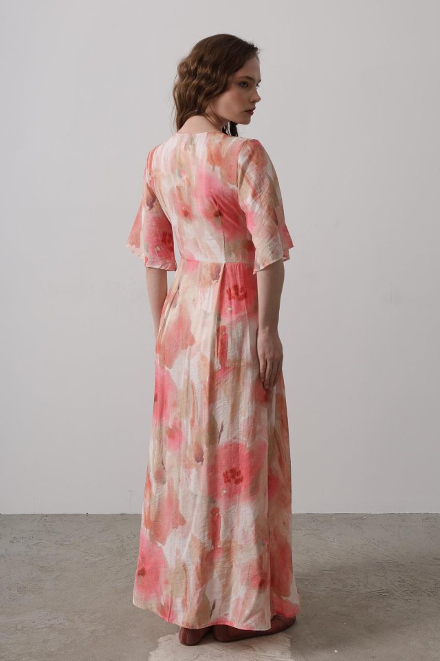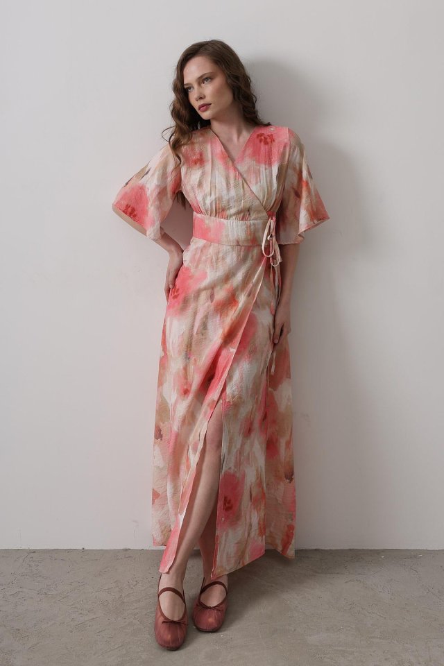 Yandan Bağlamalı Desenli Elbise – Pembe