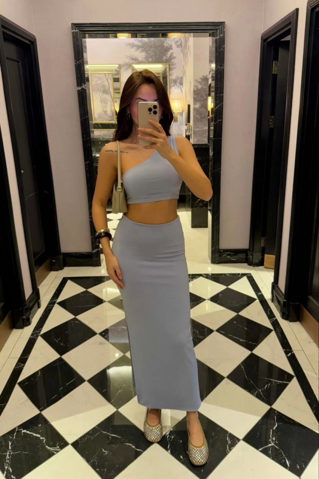 Yandan Yırtmaçlı Uzun Etek Asimetrik Crop İkili Takım – Bebek Mavisi