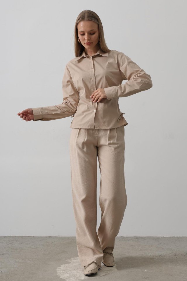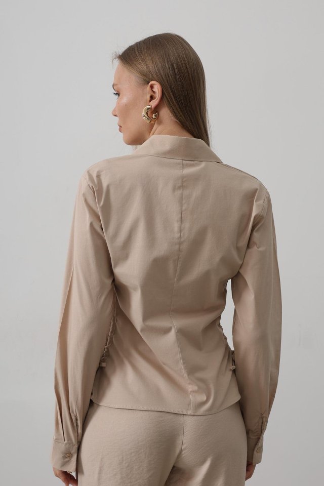 Yanları Büzgülü Çizgili Gömlek – Camel