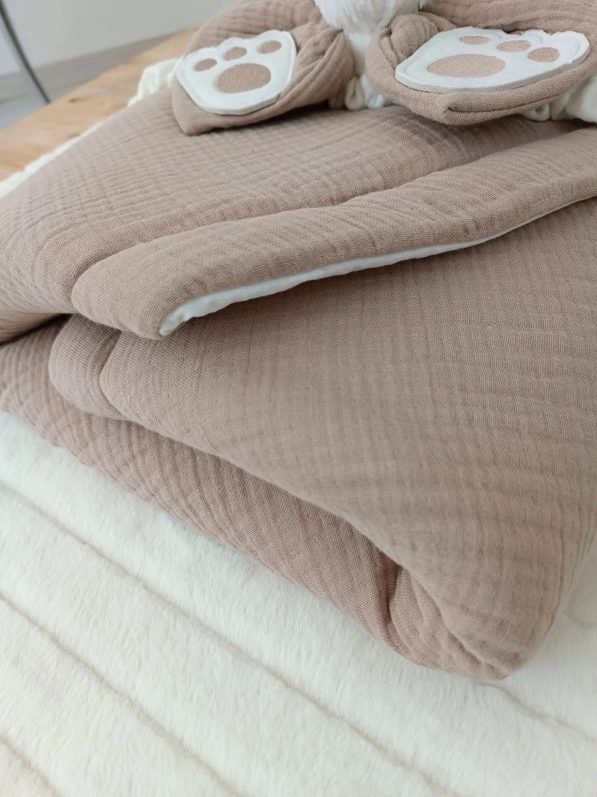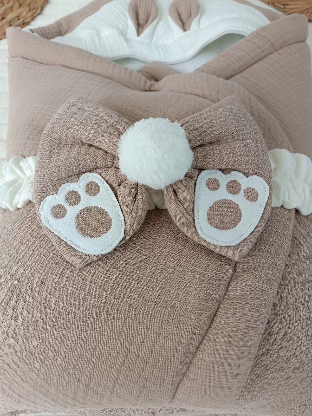 Yenidoğan 4 Kat Müslin Kumaş Kulaklı Patili Fiyonk Bebek Battaniyesi Kundak