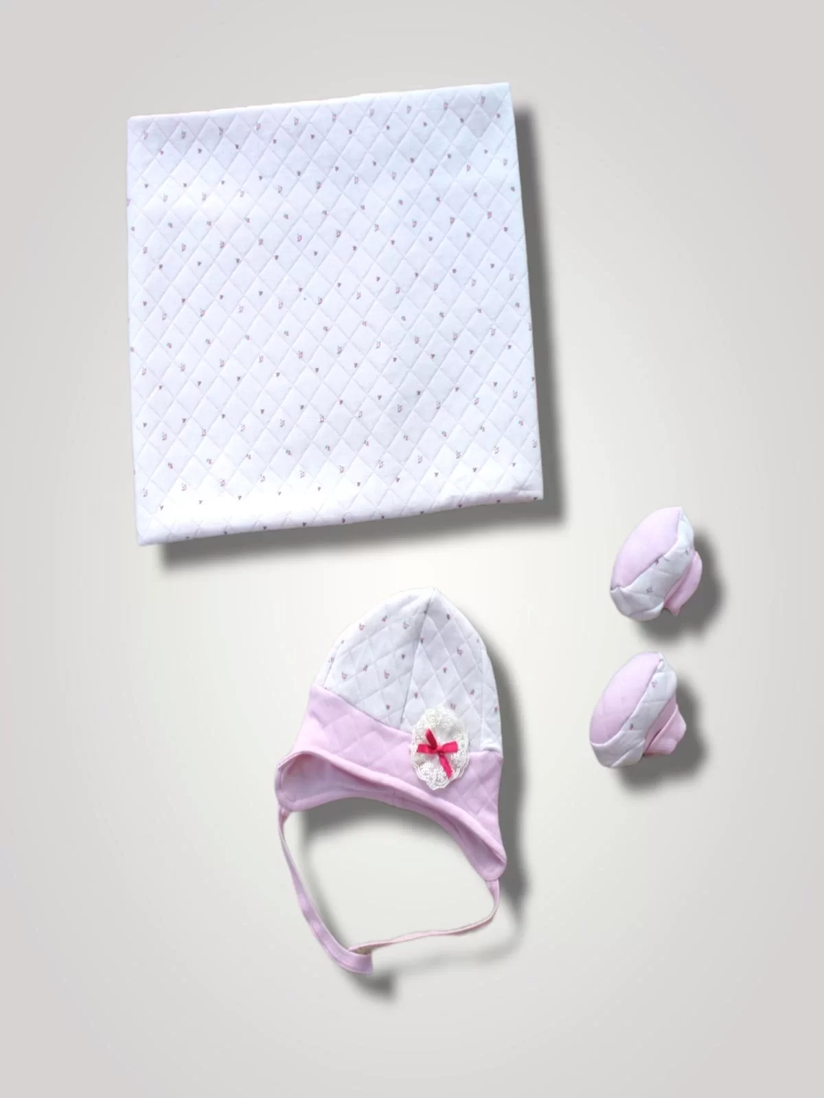 / Yenidoğan Baskılı Double Face Şapka Ve Patikli 3lü Bebek Battaniye Takımı Pembe