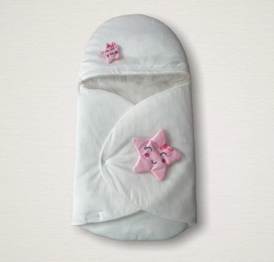 Yenidoğan Çift Yıldız Detaylı Şapkalı Duvaklı Kız Bebek Klasik Kundak Bebek Battaniyesi