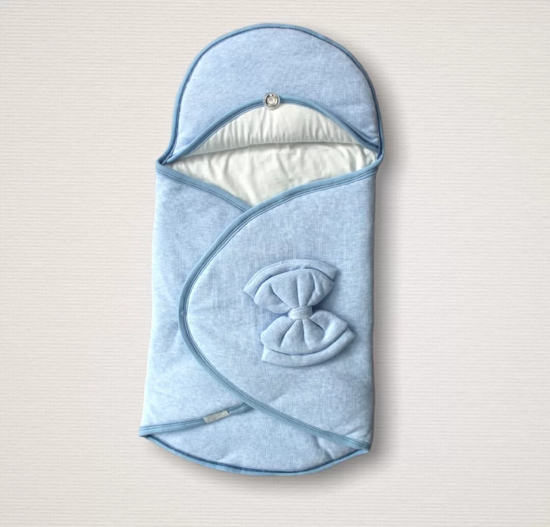 / Yenidoğan Düğme Detaylı Çizgi Efektli Çift Fiyonk Klasik Kundak Bebek Battaniyesi Mavi