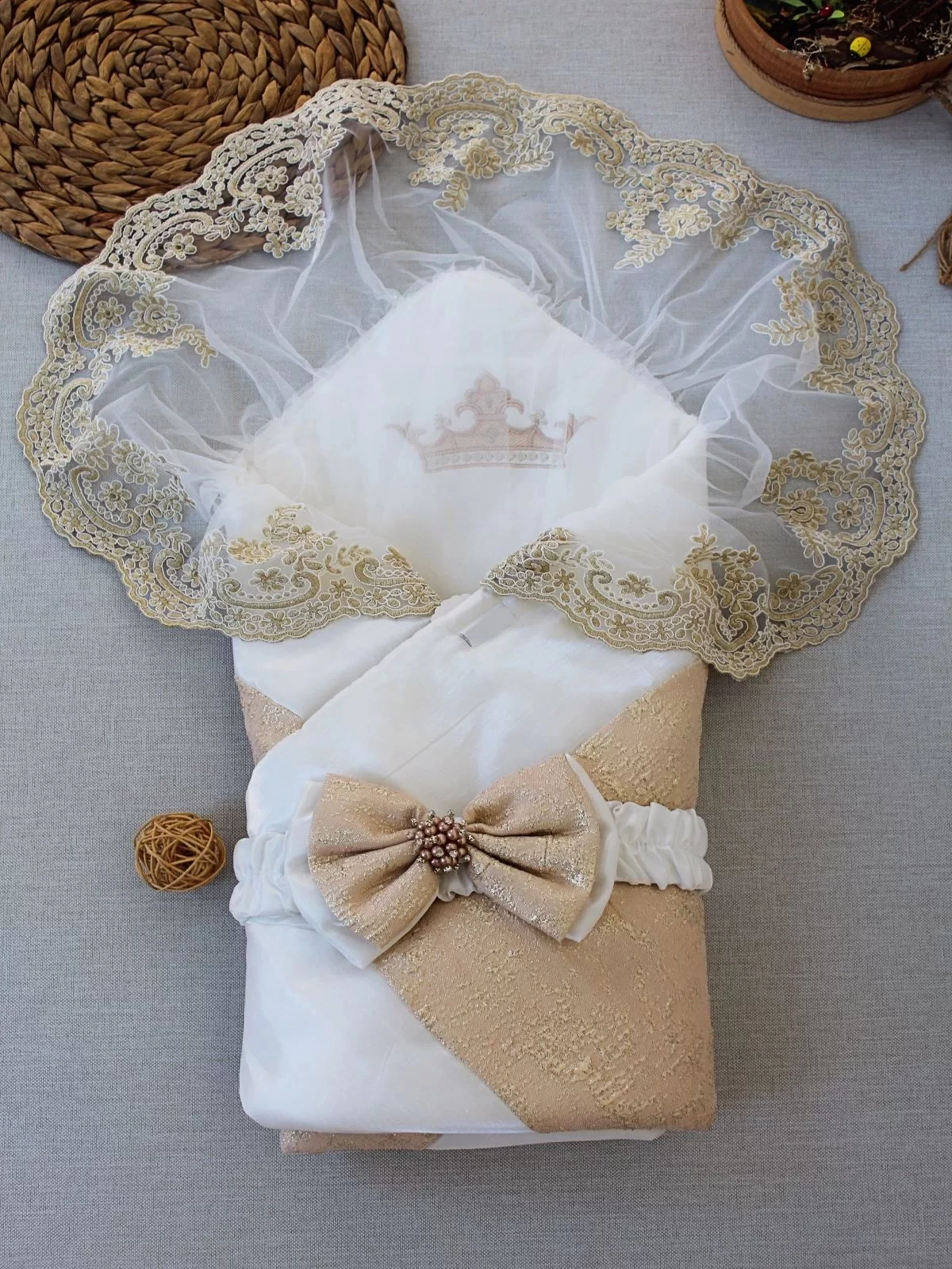 Yenidoğan Gold Zümrüt Taşlı Prizma Taç Nakışlı Lüks Duvaklı Kumru Kundak Bebek Battaniyesi