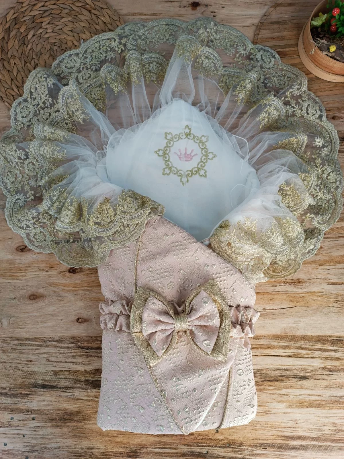 Yenidoğan Wool Yün Kumaş Taç Nakışlı Güpür Duvaklı Fiyonk Prizma Taş Unisex Kundak Bebek Battaniyesi Bej