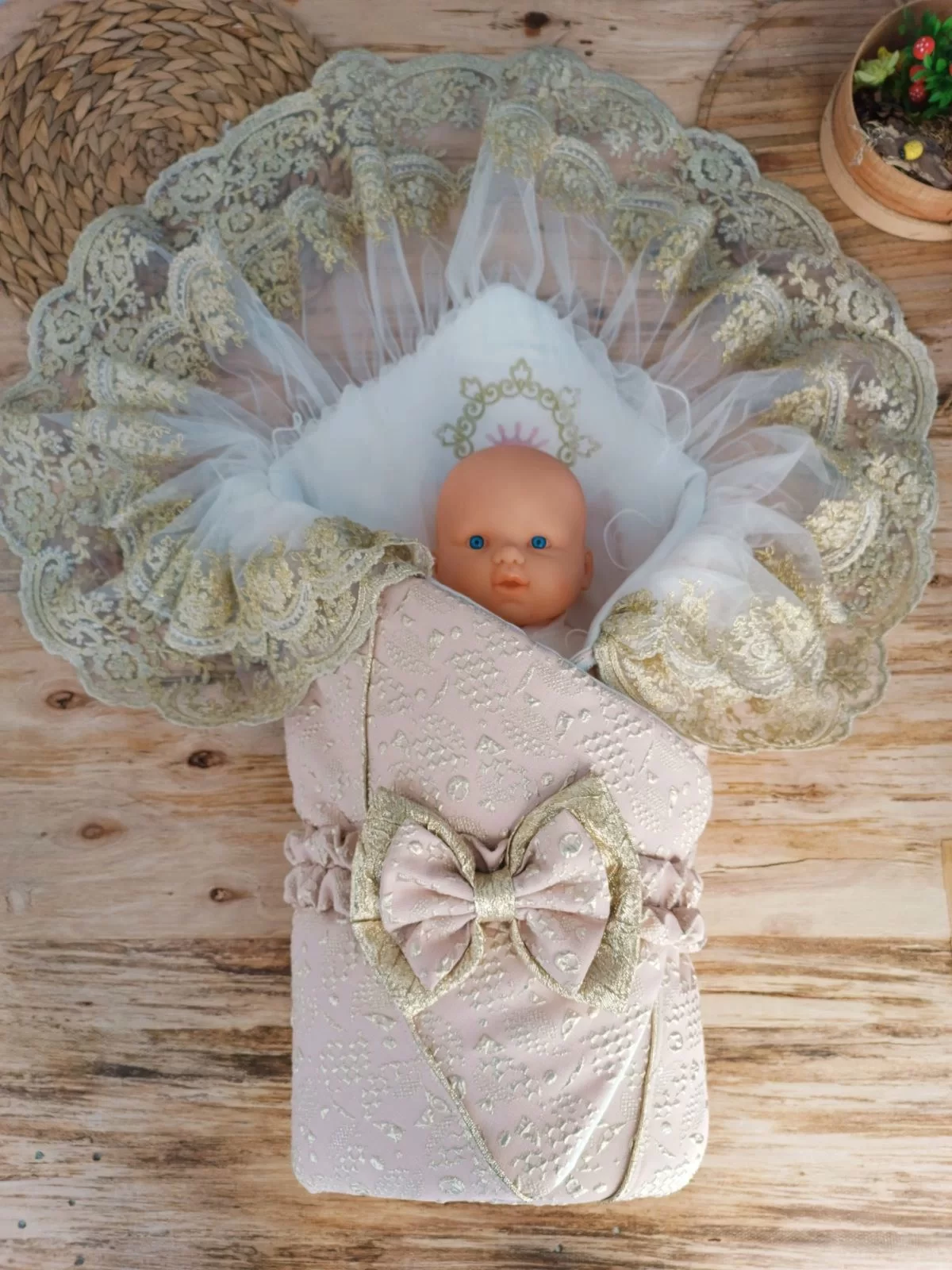 Yenidoğan Kuzulu Taç Nakış Güpürlü Fiyonklu Duvaklı Prizma Taş Unisex Kundak Bebek Battaniyesi Ekru