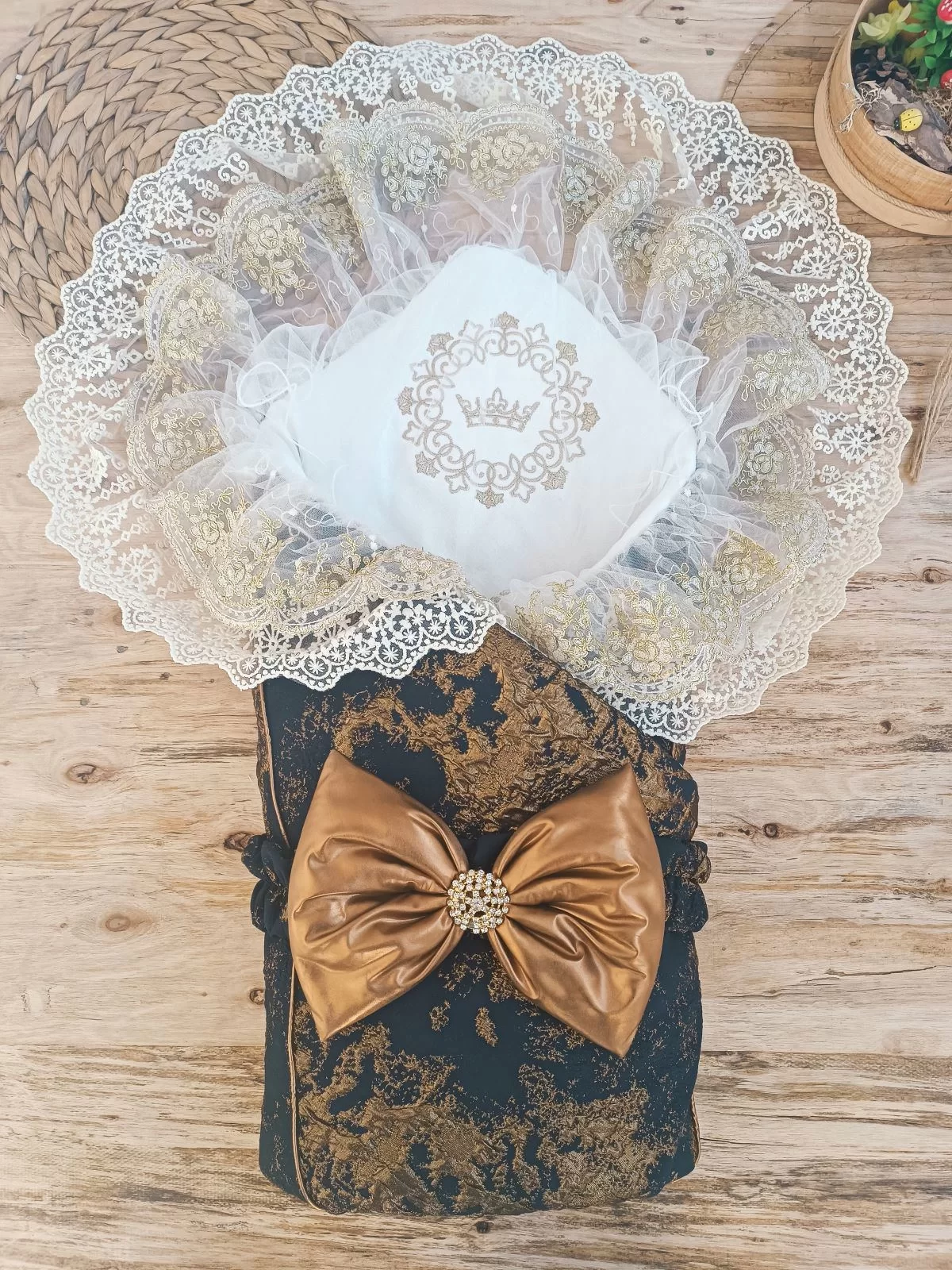 / Yenidoğan Kendinden Desenli Krom Fiyonklu Bebek Battaniyesi Kundak Bakır