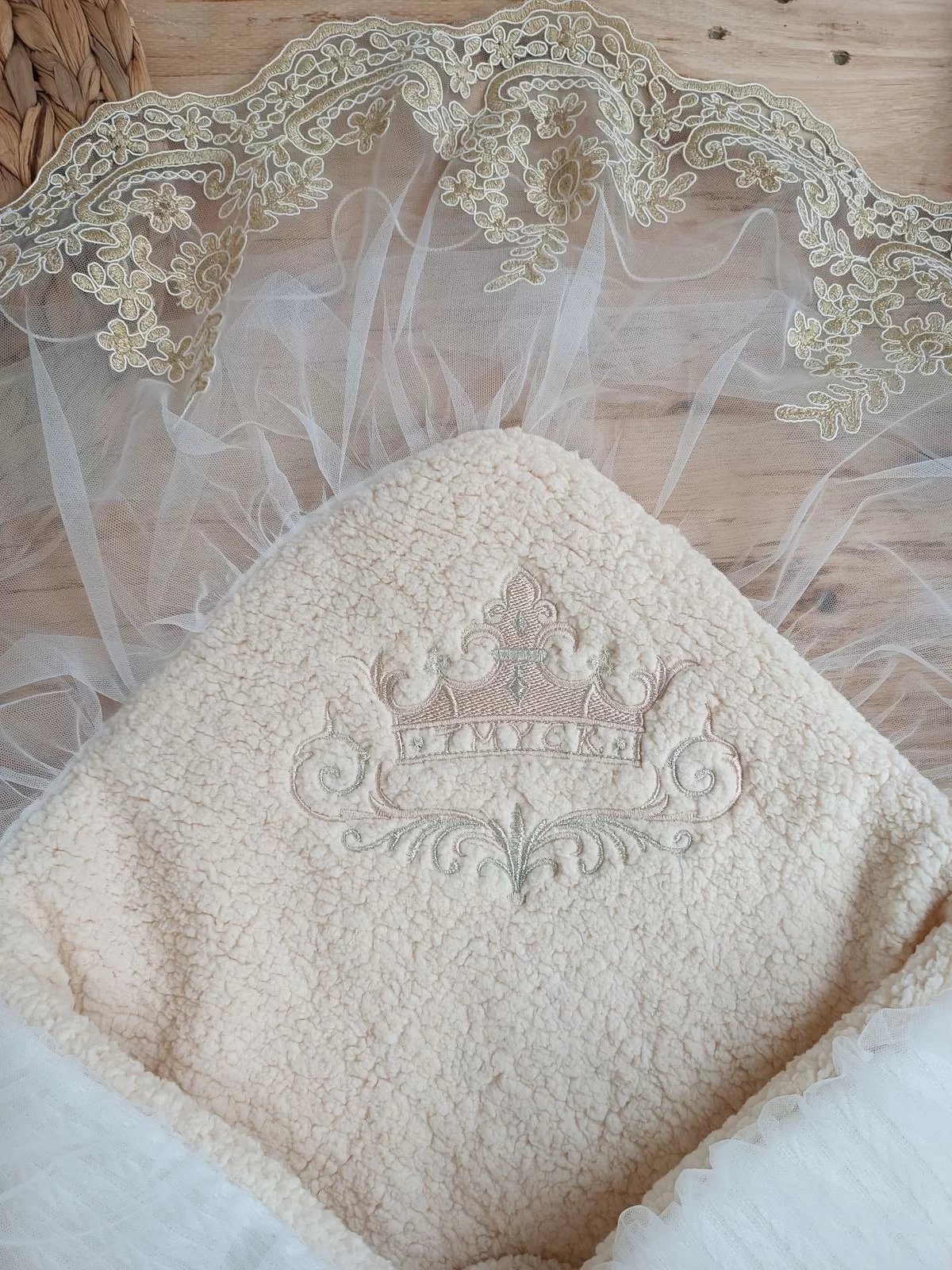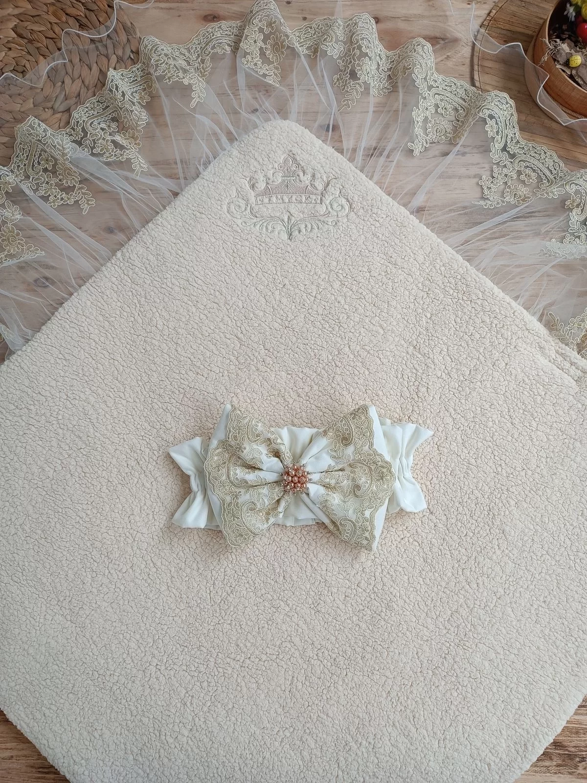 / Yenidoğan Kuzulu Taç Nakış Güpürlü Fiyonklu Duvaklı Prizma Taş Unisex Kundak Bebek Battaniyesi Ekru