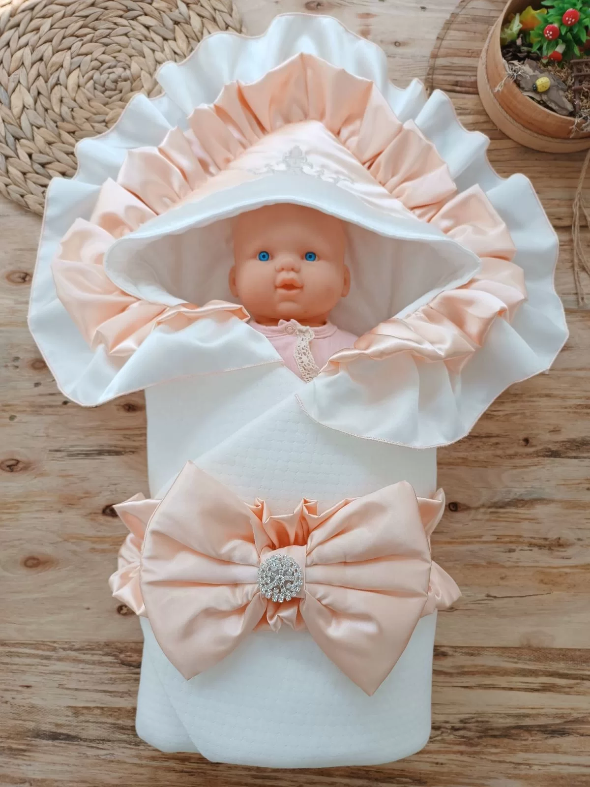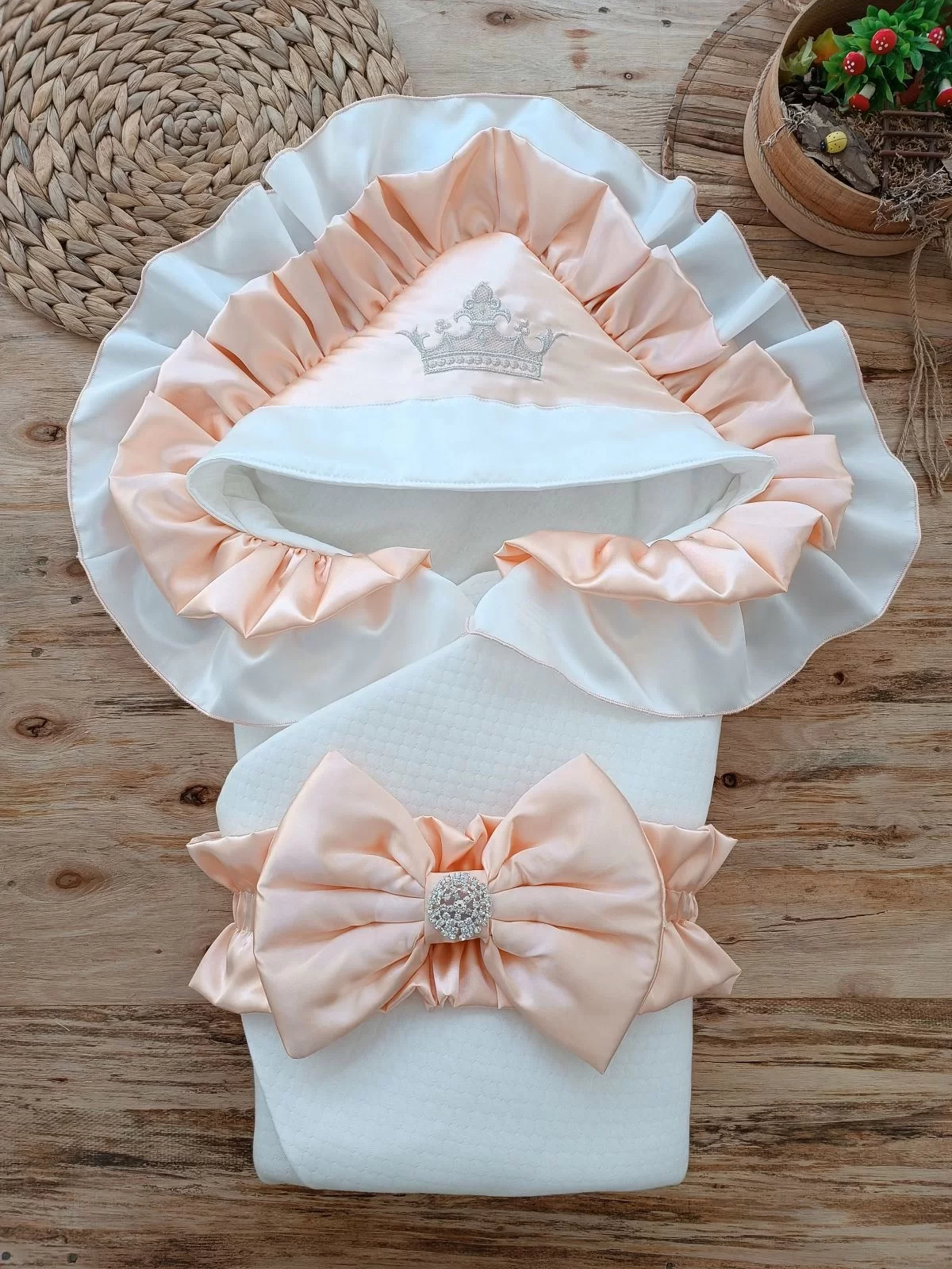 Yenidoğan Kuzulu Taç Nakış Güpürlü Fiyonklu Duvaklı Prizma Taş Unisex Kundak Bebek Battaniyesi Ekru