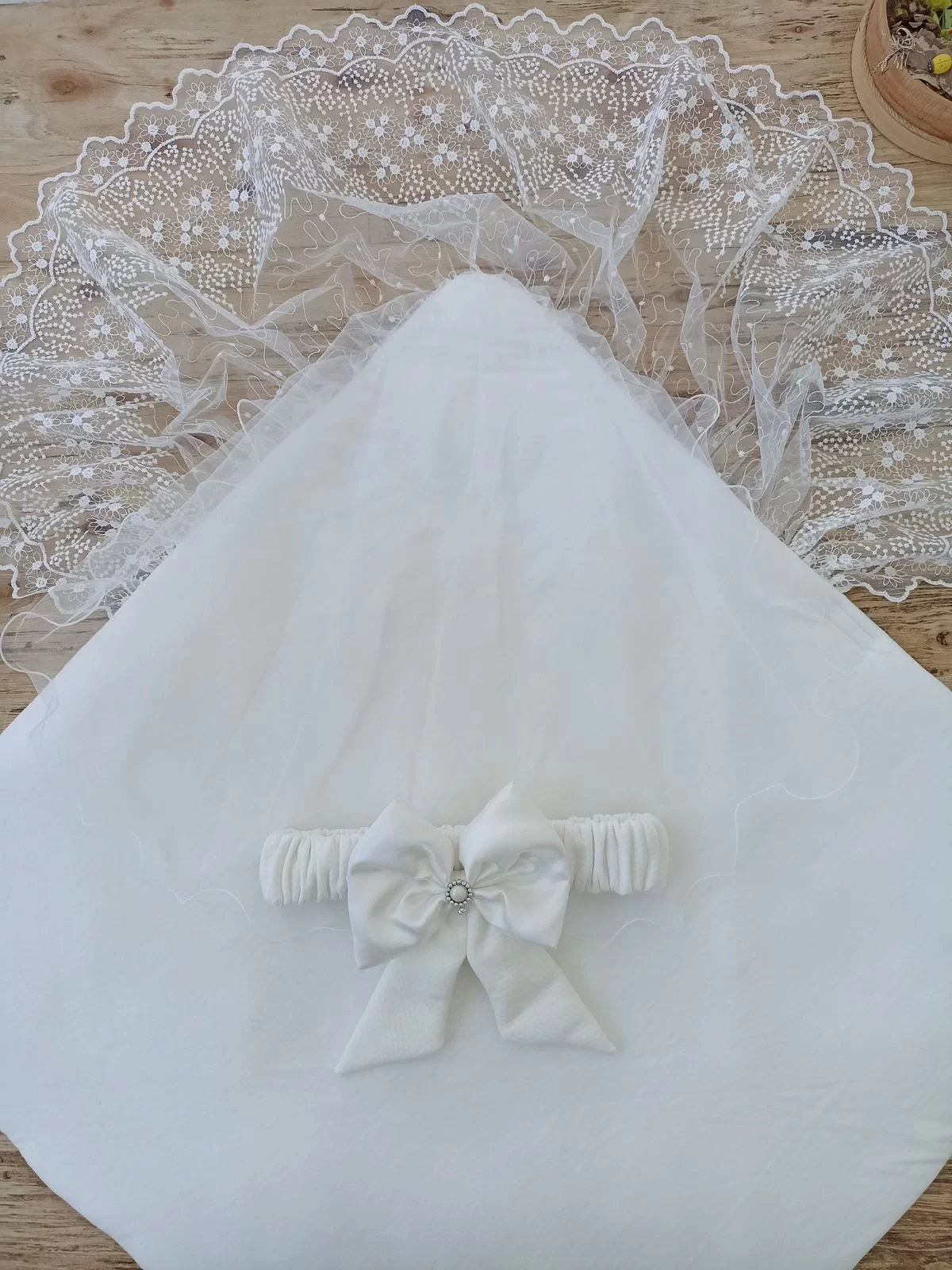 Yenidoğan Wool Yün Kumaş Taç Nakışlı Güpür Duvaklı Fiyonk Prizma Taş Unisex Kundak Bebek Battaniyesi Bej