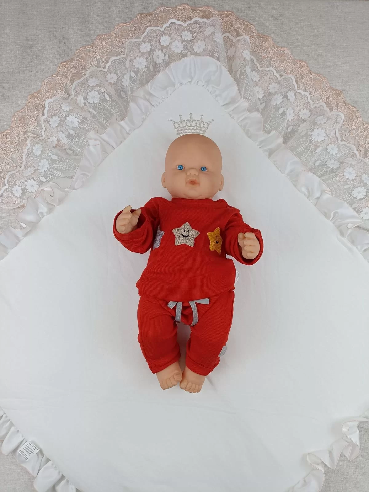 Yenidoğan Antalya Taç Nakışlı Kundaklı Trilüks Unisex 3lü Alt Açma Seti Ekru