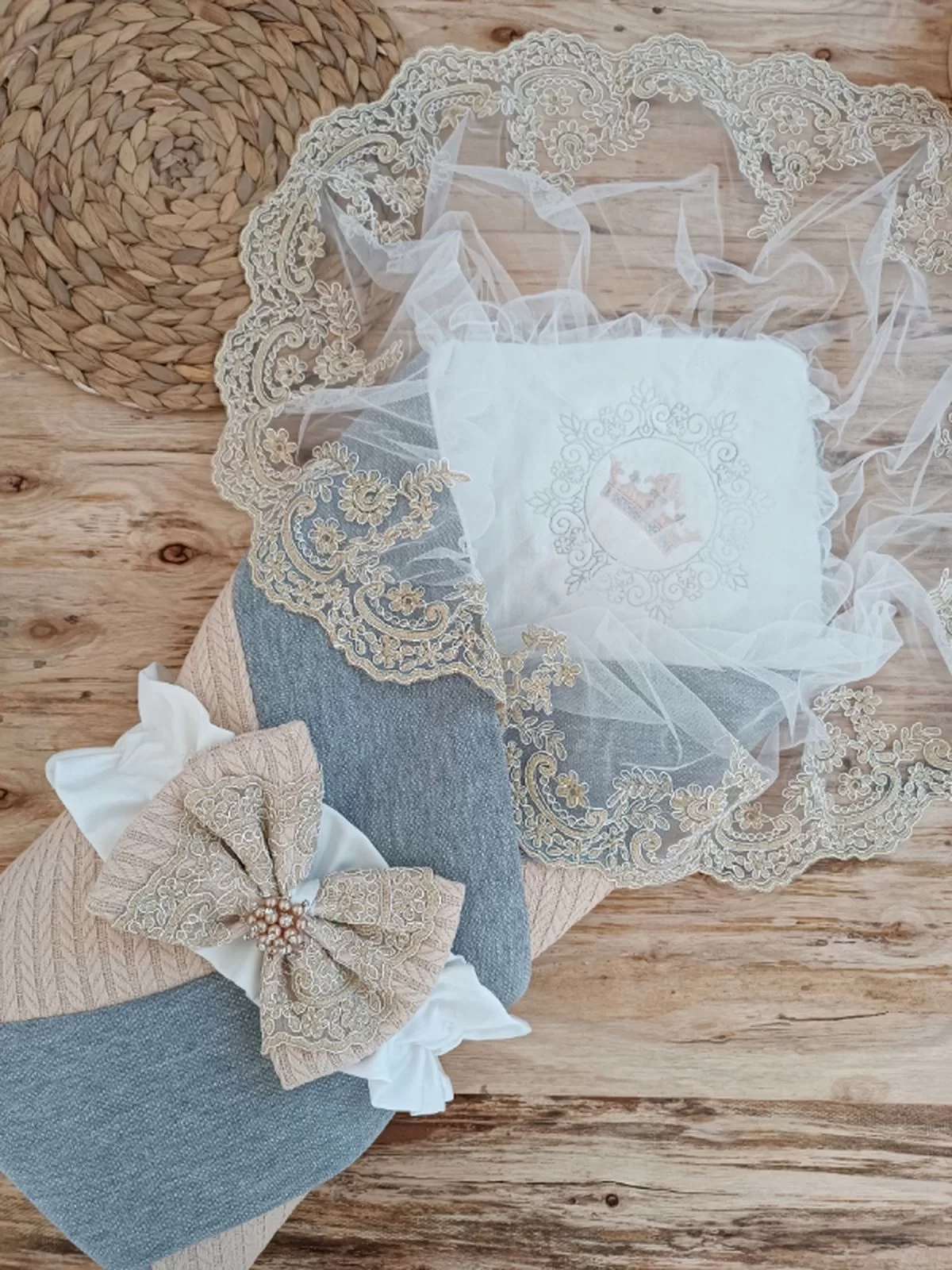 Yenidoğan Wool Yün Kumaş Taç Nakışlı Güpür Duvaklı Fiyonk Prizma Taş Unisex Kundak Bebek Battaniyesi Bej