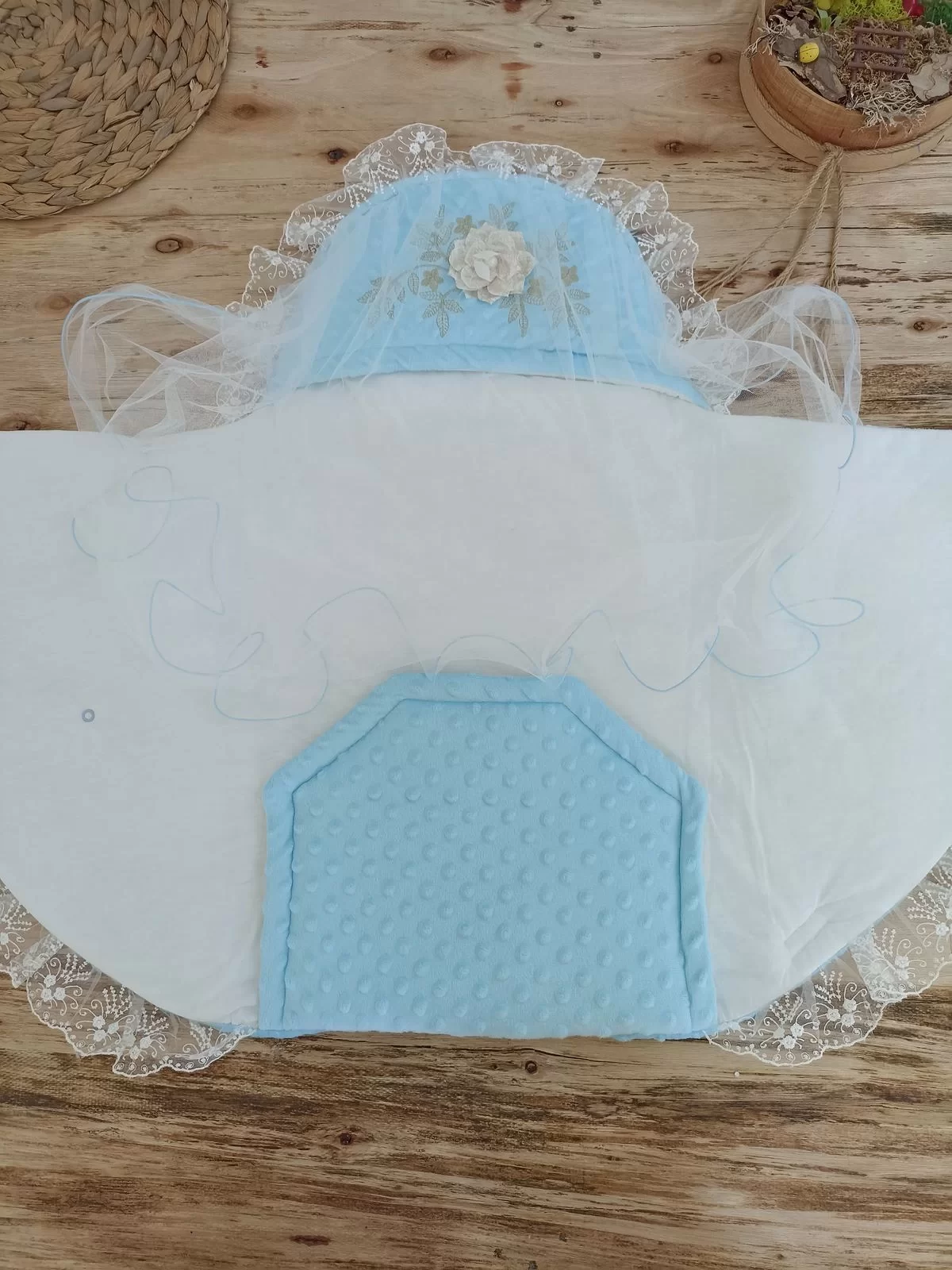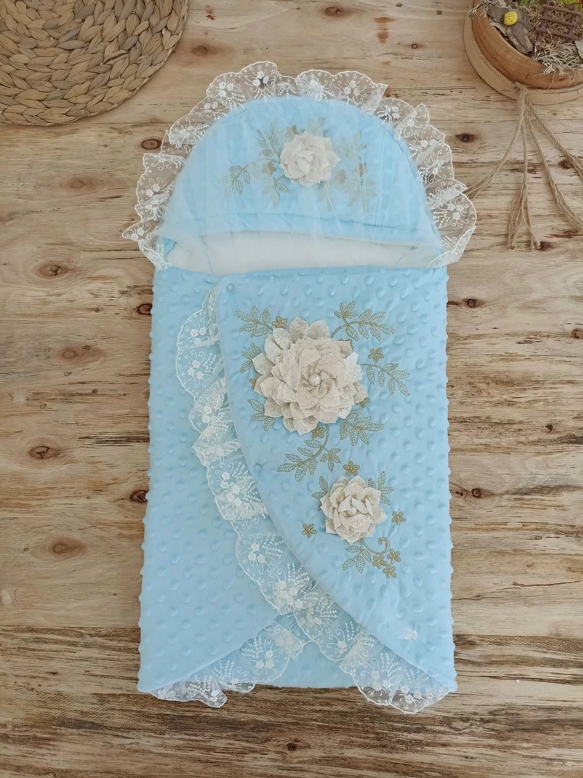 / Yenidoğan Topçikli Gül Bahçesi Tül Örtülü Kız Erkek Bebek Klasik Kundak Bebek Battaniyesi Mavi