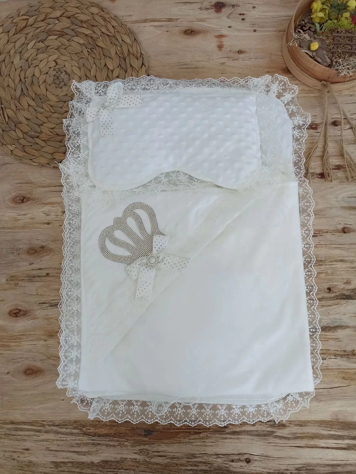 Yenidoğan Topitos Taşlı Taç Nakışlı İnci Fiyonk Dantelli 3lü Alt Açma Seti