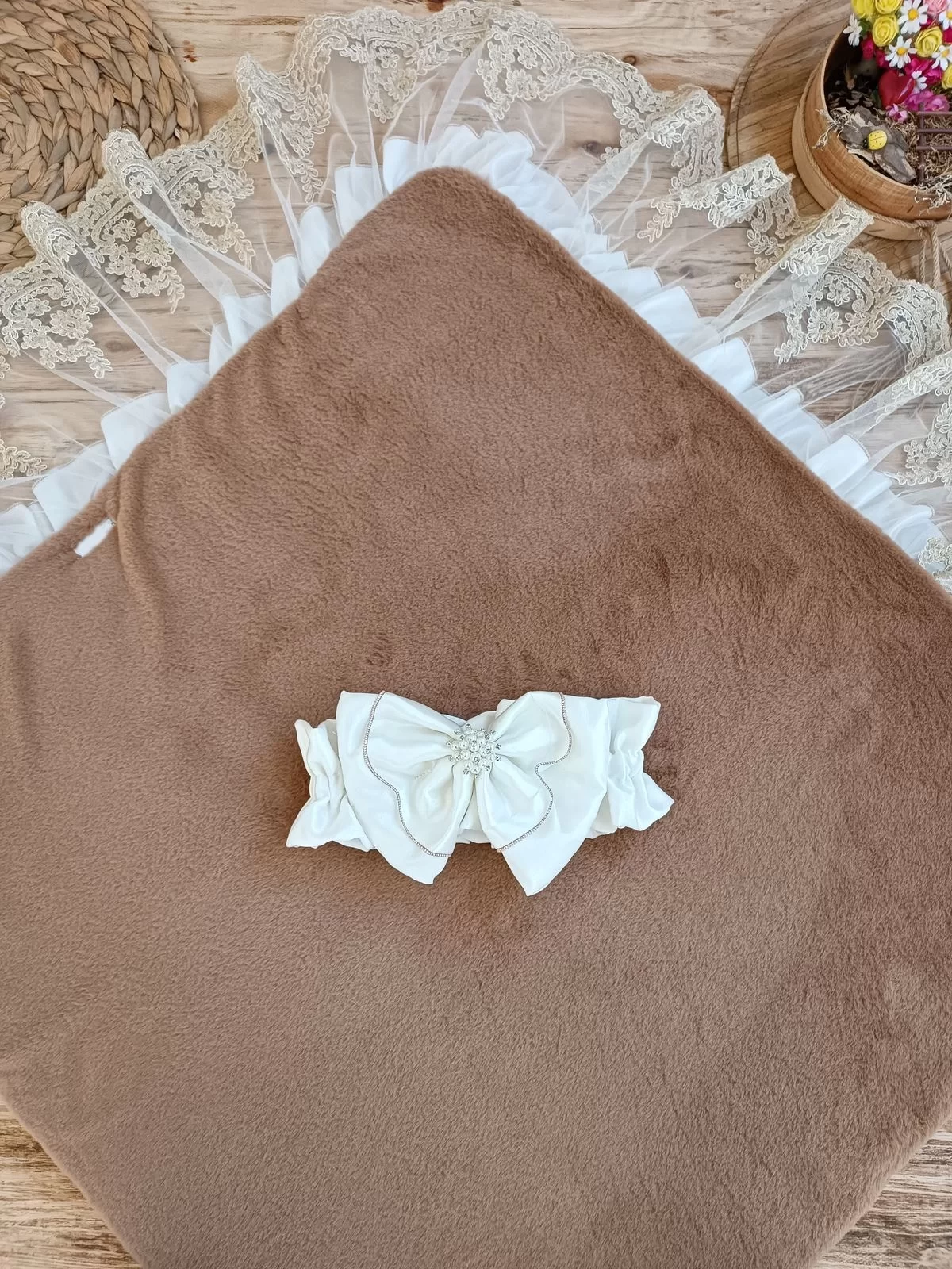 Yenidoğan Wool Yün Kumaş Taç Nakışlı Güpür Duvaklı Fiyonk Prizma Taş Unisex Kundak Bebek Battaniyesi Kahverengi