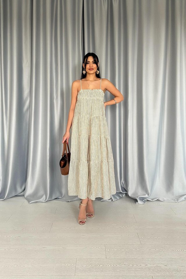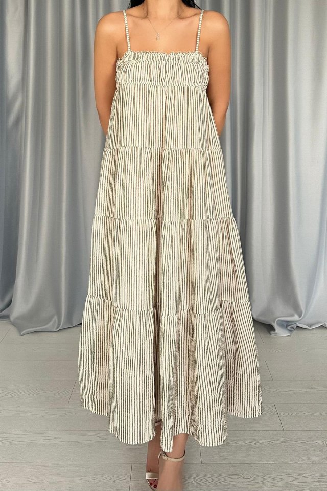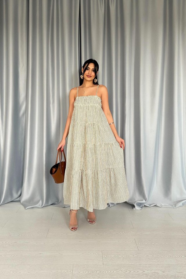 Yeşil Askılı Parçalı Çizgili Müslin Elbise