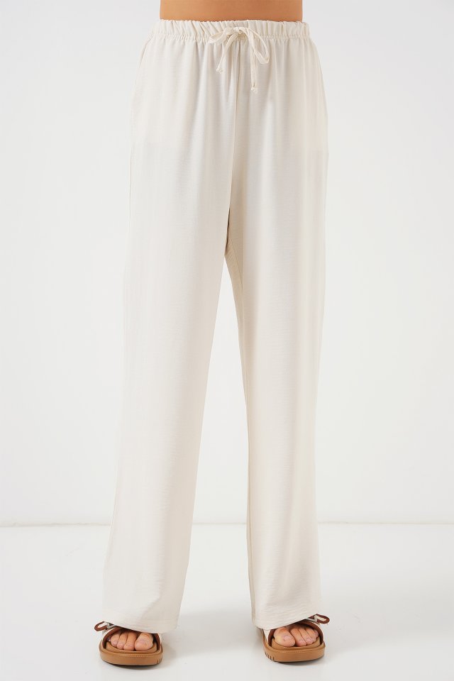 Yüksek Bel Bol Paça Pantolon – Krem